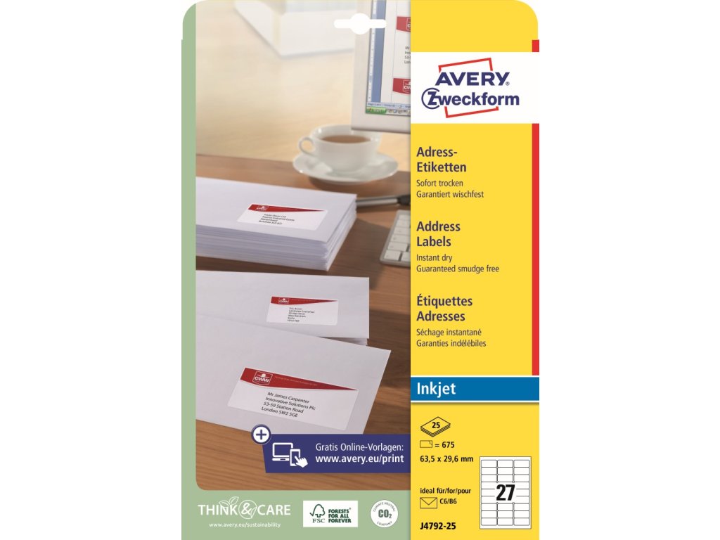 Adresní etikety | pro Inkjet | Avery Zweckform J4792-25 + online software pro tisk etiket + tiskové šablony ke stažení zdarma