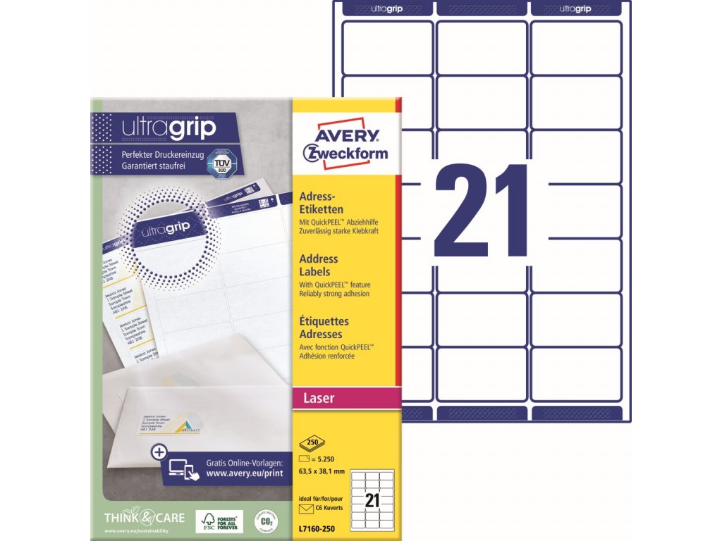Samolepicí adresní štítky Avery Zweckform L7160-250 o rozměru 63,5 x 38,1 mm jsou ideální pro profesionální a rychlý tisk zpátečních adres či firemních údajů. Skvěle se hodí na všechny typy obálek, balíků a zásilek, ale i pro univerzální použití ve výrobě, obchodě i kanceláři. Tyto bílé extra silné papírové etikety s permanentním lepidlem mají vysokou a stálou lepivost na běžných površích jako je papír, karton, sklo nebo plast.