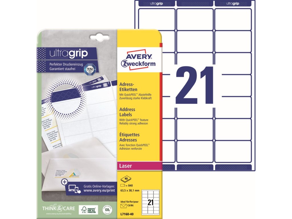 Samolepicí adresní štítky Avery Zweckform L7160-40 o rozměru 63,5 x 38,1 mm jsou ideální pro profesionální a rychlý tisk zpátečních adres či firemních údajů. Skvěle se hodí na všechny typy obálek, balíků a zásilek, ale i pro univerzální použití ve výrobě, obchodě i kanceláři. Tyto bílé extra silné papírové etikety s permanentním lepidlem mají vysokou a stálou lepivost na běžných površích jako je papír, karton, sklo nebo plast.