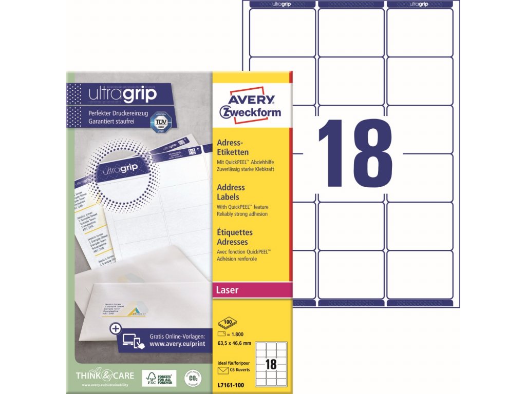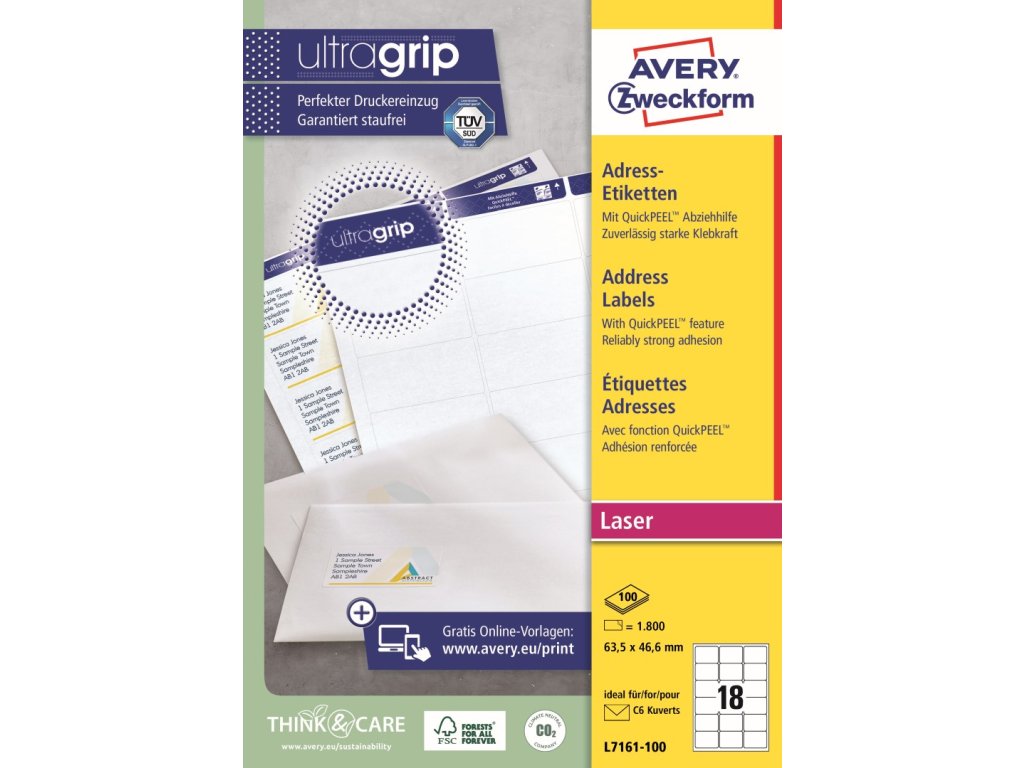Samolepicí adresní štítky Avery Zweckform L7161-100 o rozměru 63,5 x 46,6 mm jsou ideální pro profesionální a rychlý tisk adres či firemních údajů. Skvěle se hodí na všechny typy obálek, balíků a zásilek, ale i pro univerzální použití ve výrobě, obchodě i kanceláři. Tyto bílé extra silné papírové etikety s permanentním lepidlem mají vysokou a stálou lepivost na běžných površích jako je papír, karton, sklo nebo plast.