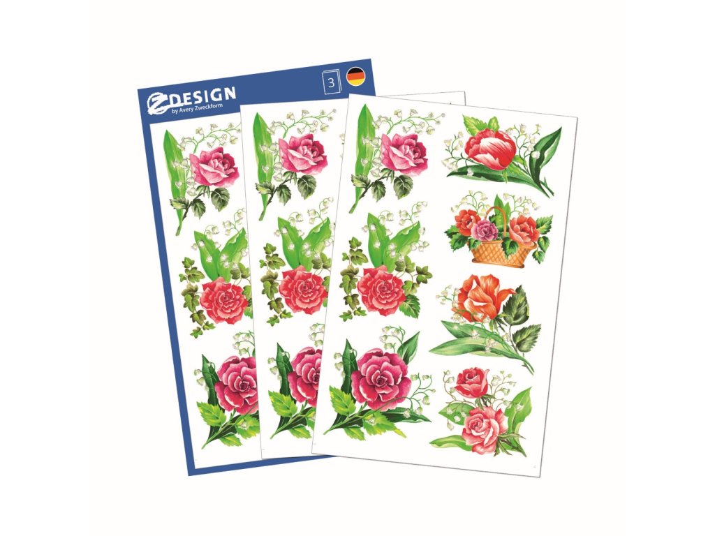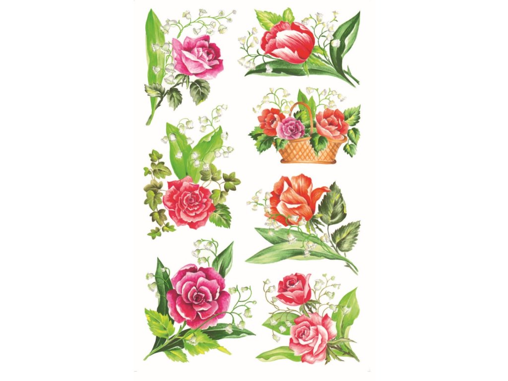 21 ks samolepek v balení, papírové, permanentní lepidlo, motiv růže. Balení obsahuje 3 stejné aršíky vyobrazených samolepek.