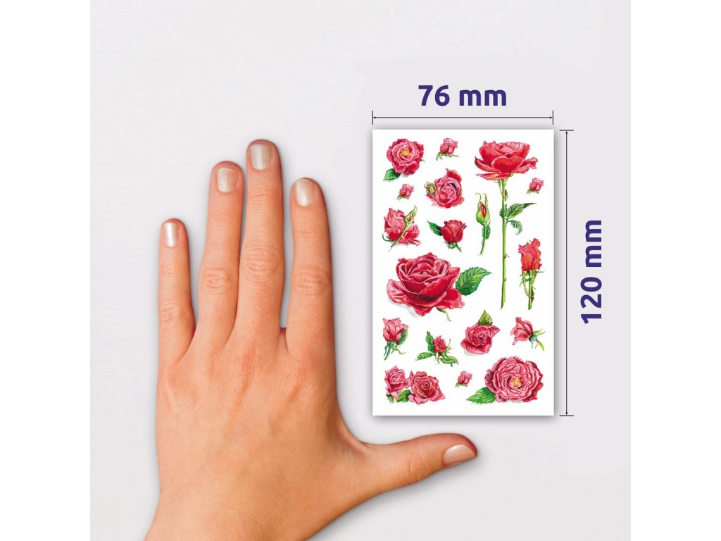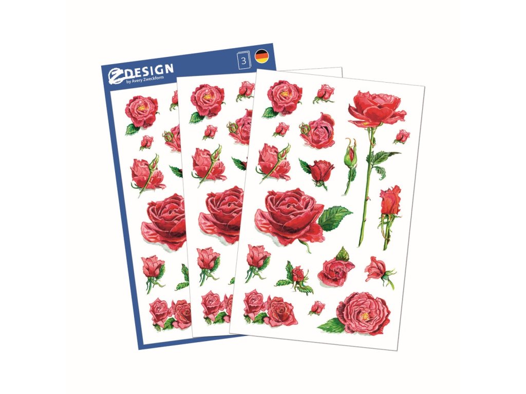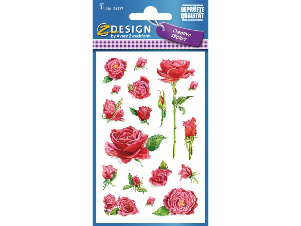 54 ks samolepek v balení, papírové, permanentní lepidlo, motiv růže. Balení obsahuje 3 stejné aršíky vyobrazených samolepek.