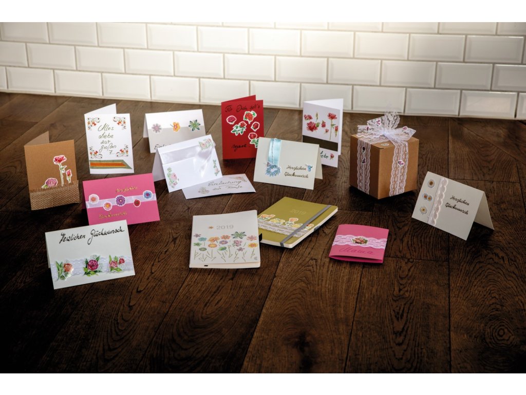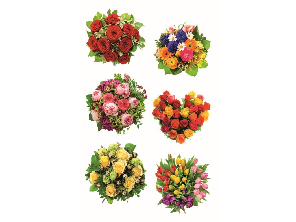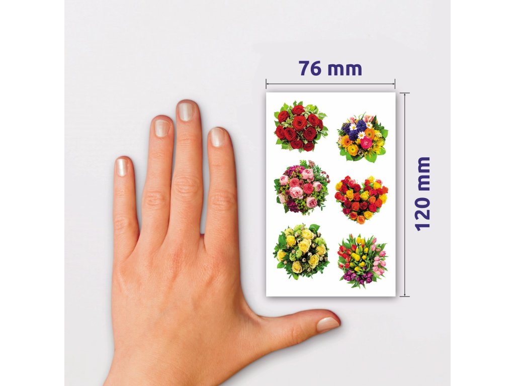 12 ks samolepek v balení, papírové, permanentní lepidlo, motiv kytice. Balení obsahuje 2 stejné aršíky vyobrazených samolepek.