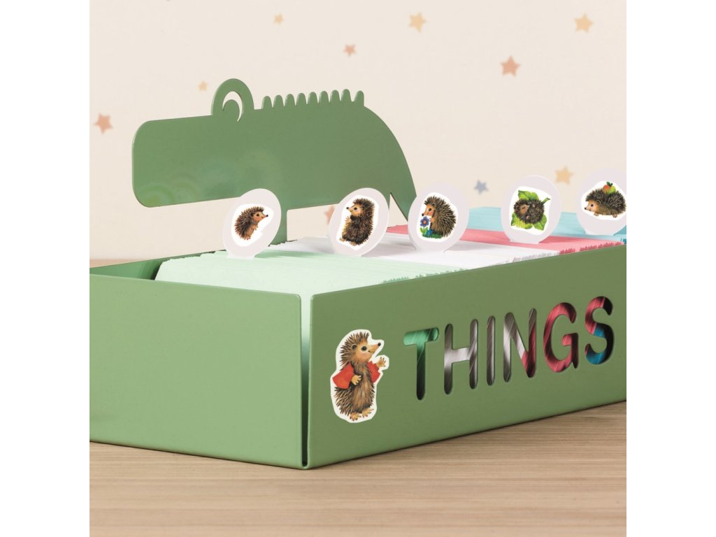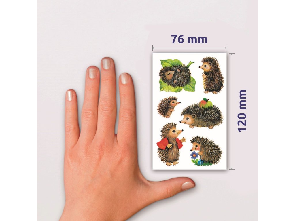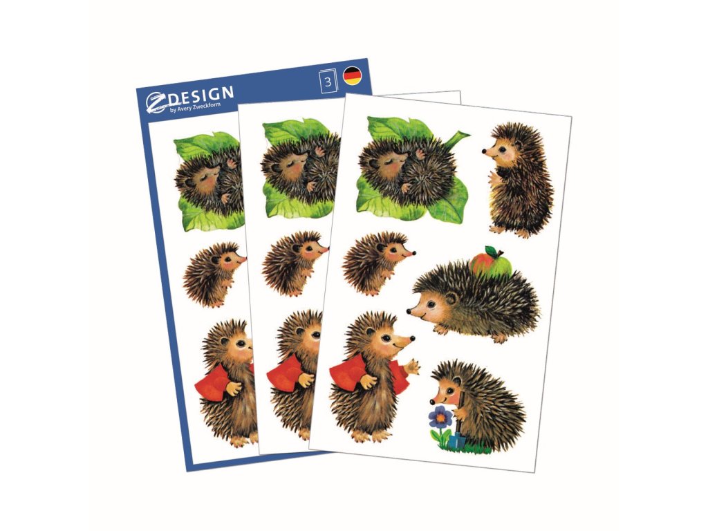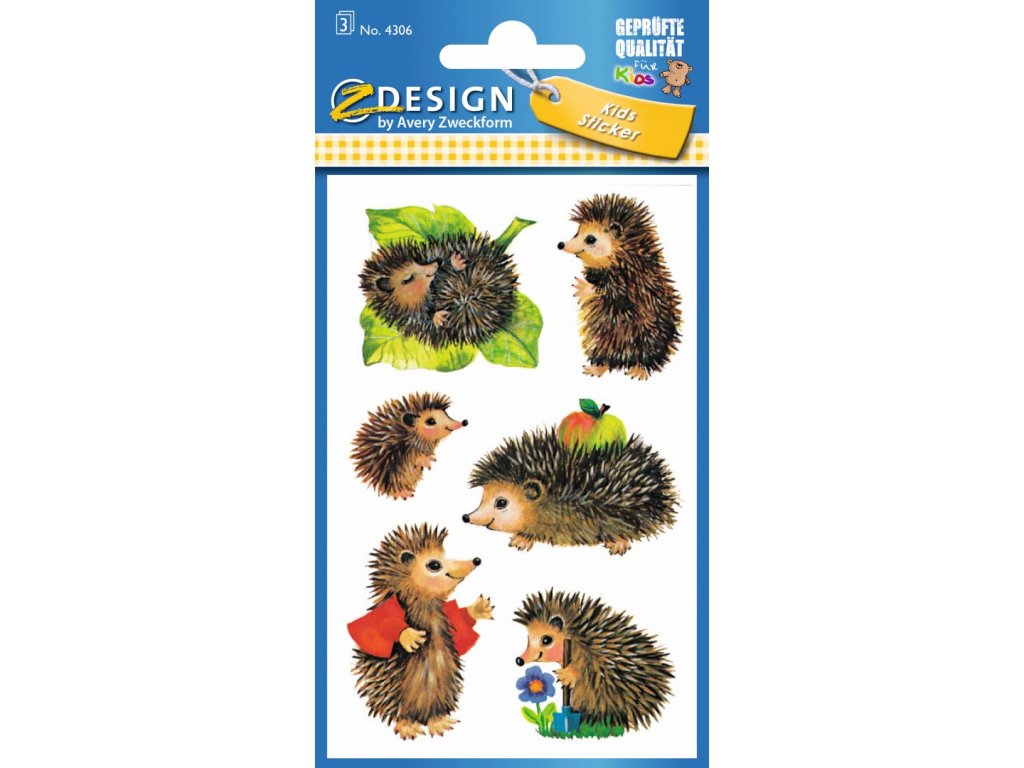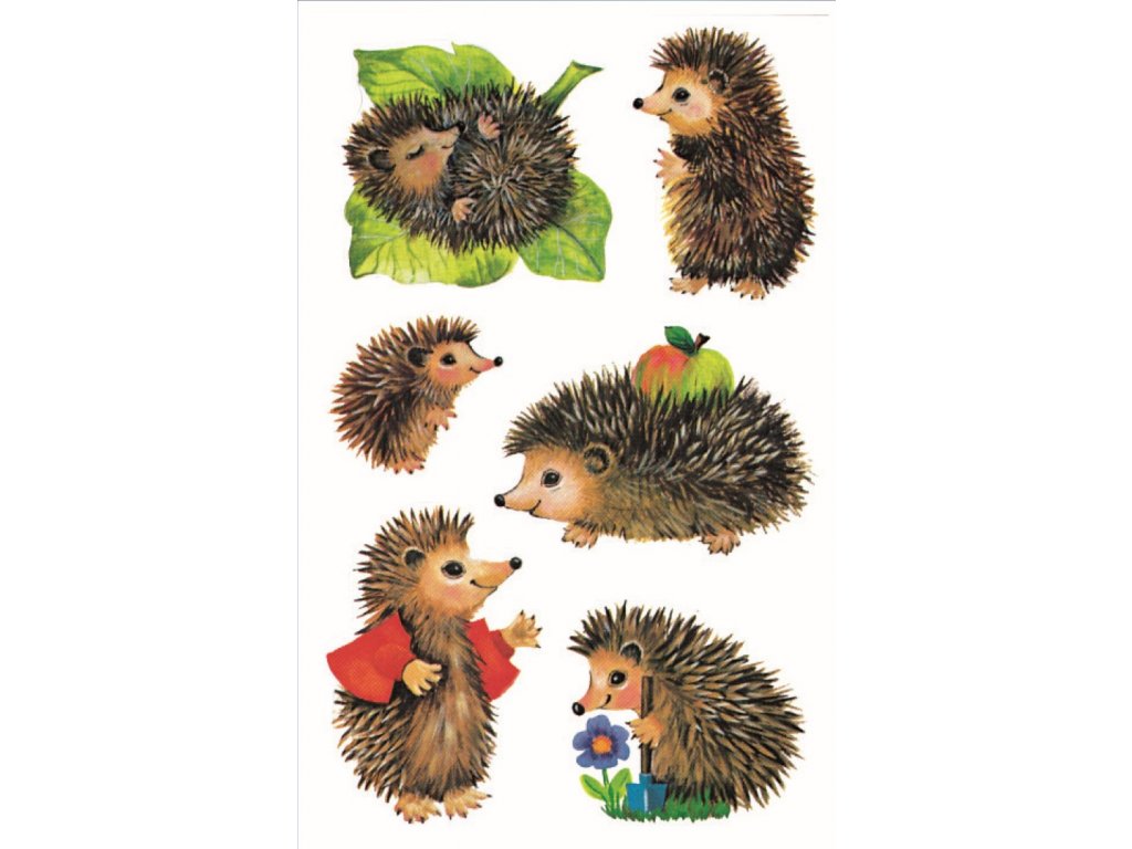 18 ks samolepek v balení, papírové, permanentní lepidlo, motiv ježci. Balení obsahuje 3 stejné aršíky vyobrazených samolepek.