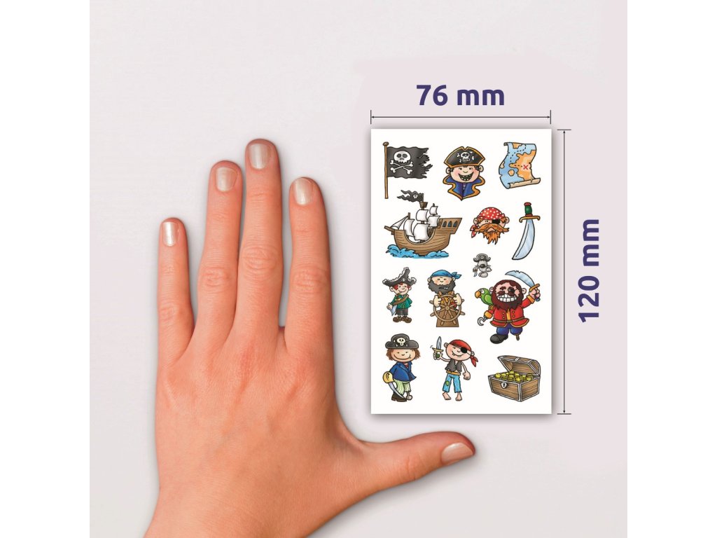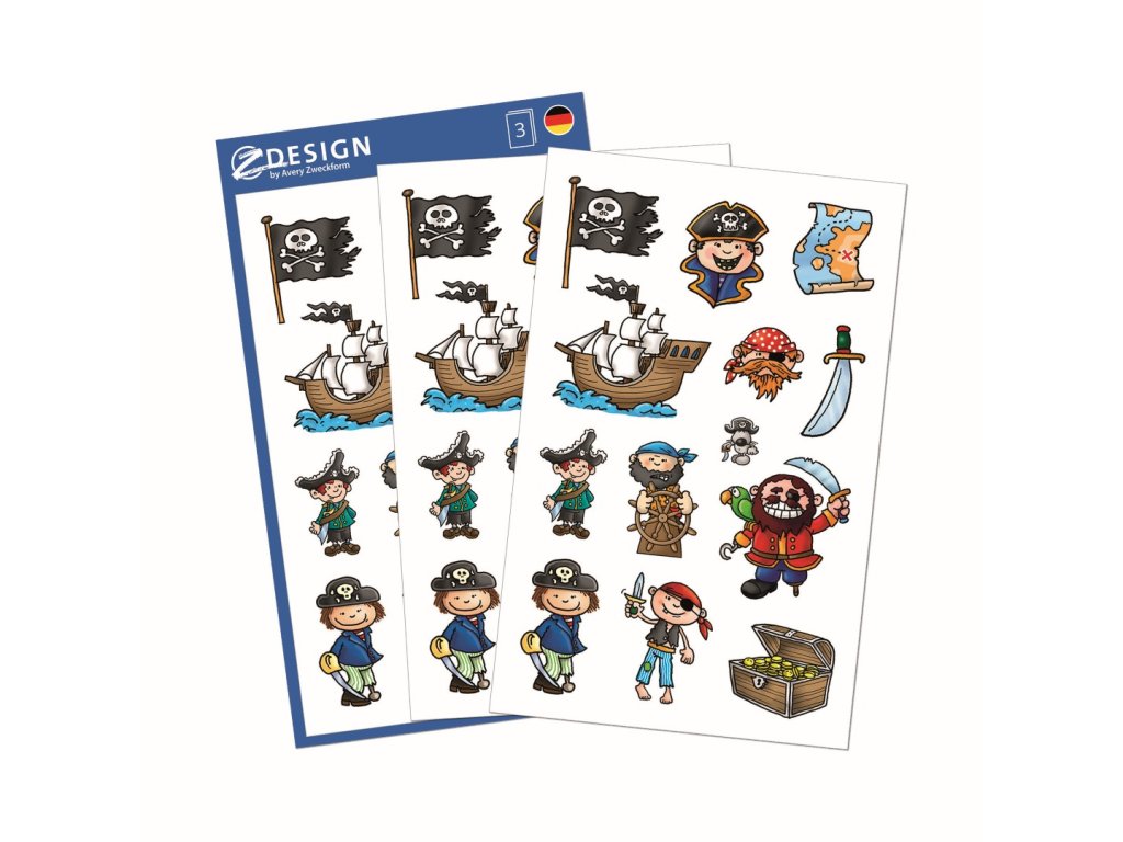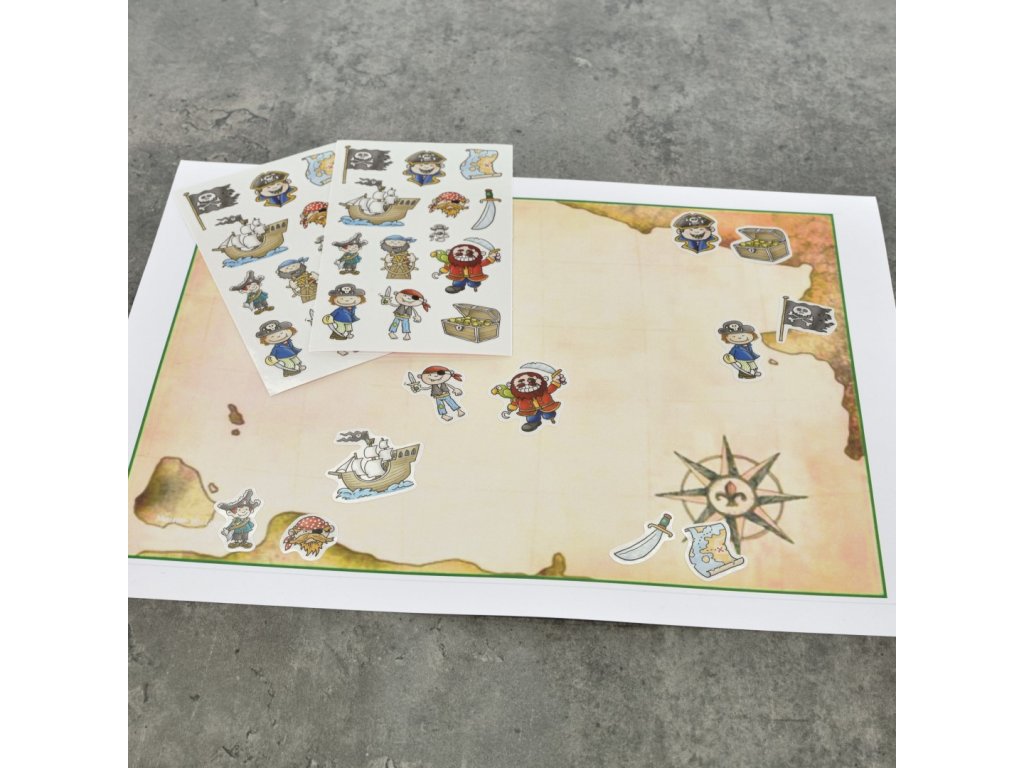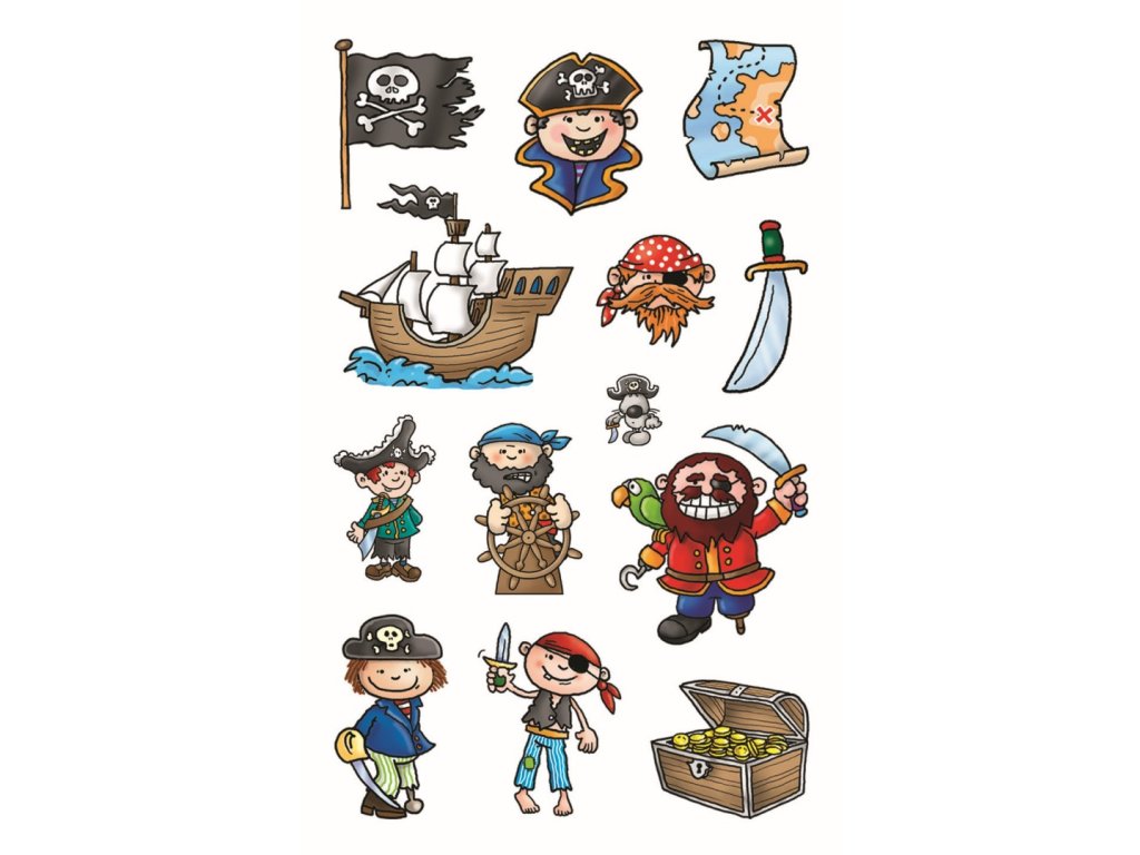 39 ks samolepek v balení, papírové, permanentní lepidlo, motiv piráti. Balení obsahuje 3 stejné aršíky vyobrazených samolepek.