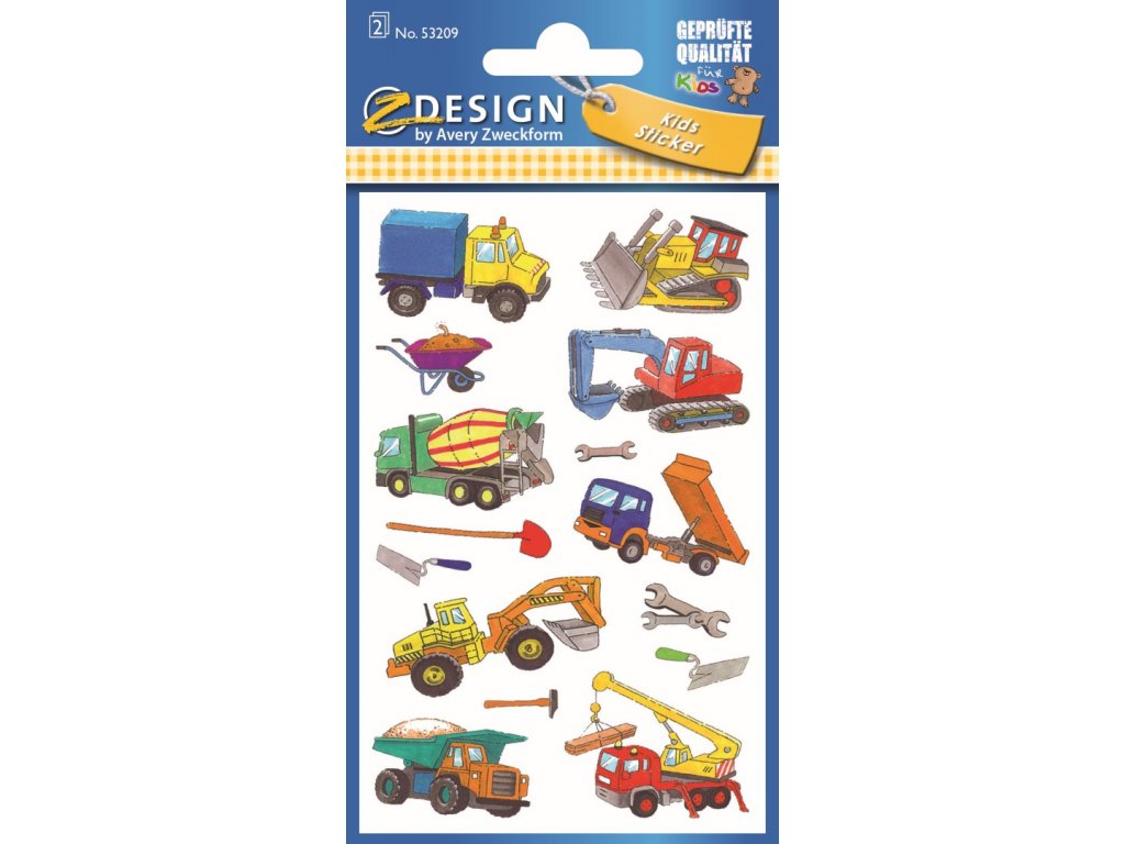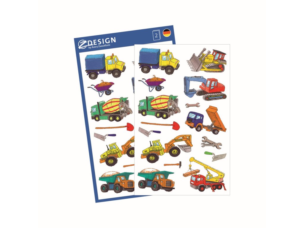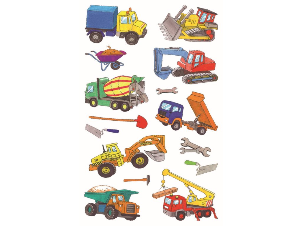 30 ks samolepek v balení, papírové, permanentní lepidlo, motiv stavební stroje. Balení obsahuje 2 stejné aršíky vyobrazených samolepek.