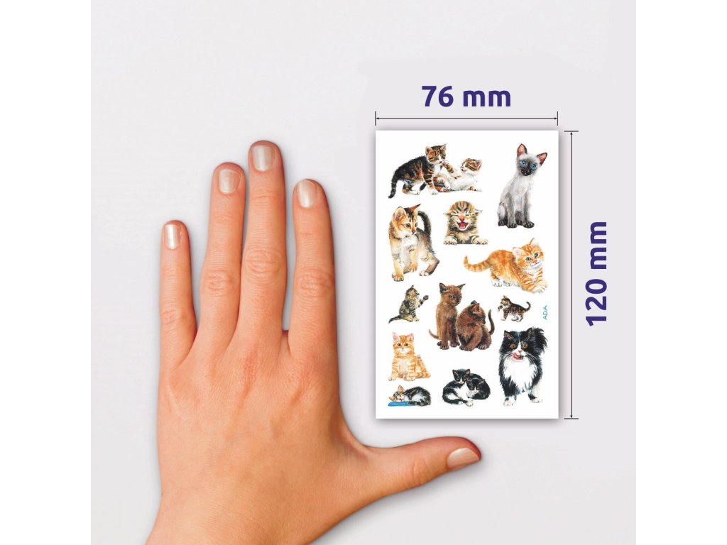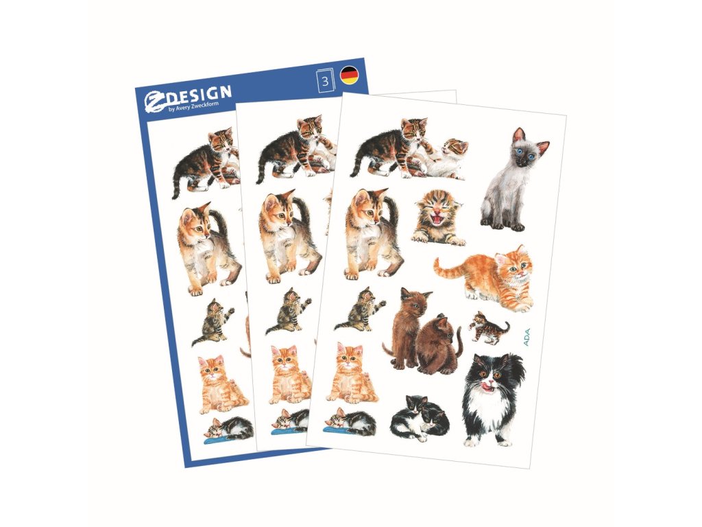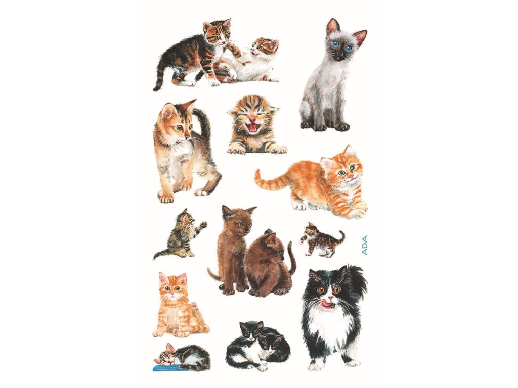 36 ks samolepek v balení, papírové, permanentní lepidlo, motiv koťata. Balení obsahuje 3 stejné aršíky vyobrazených samolepek.