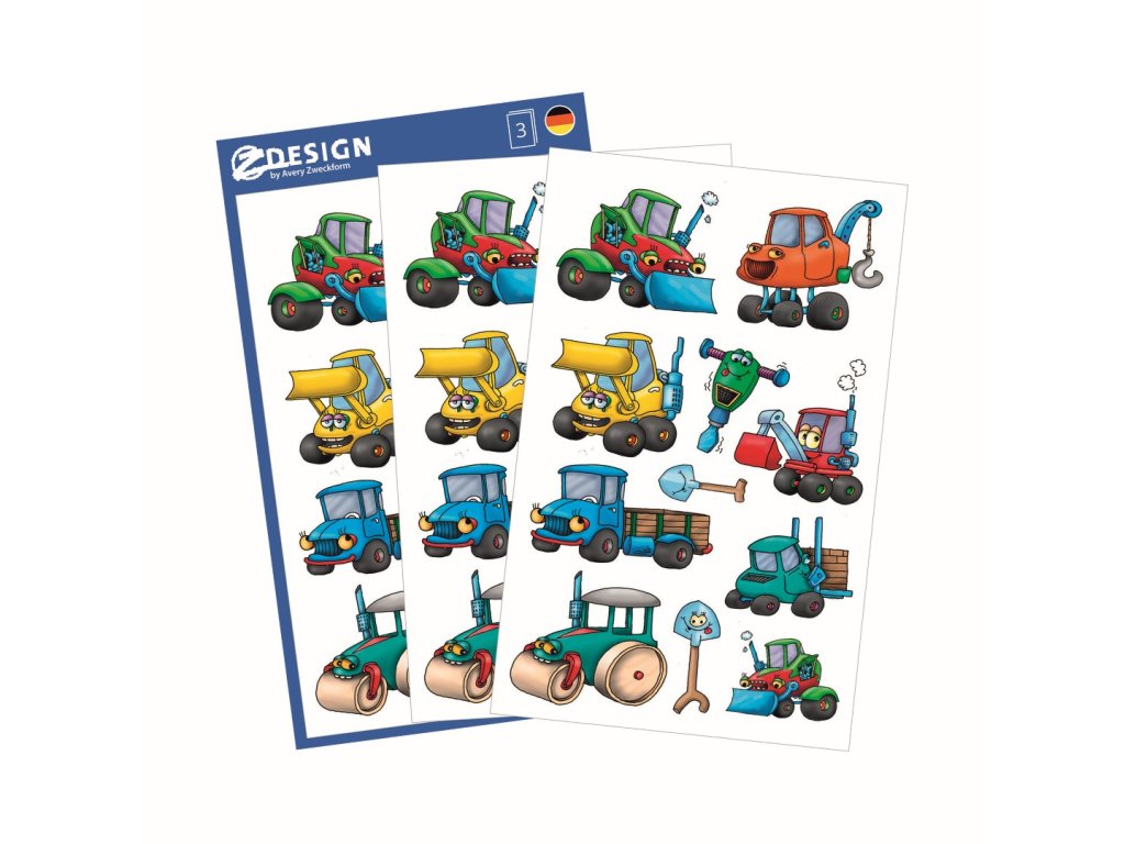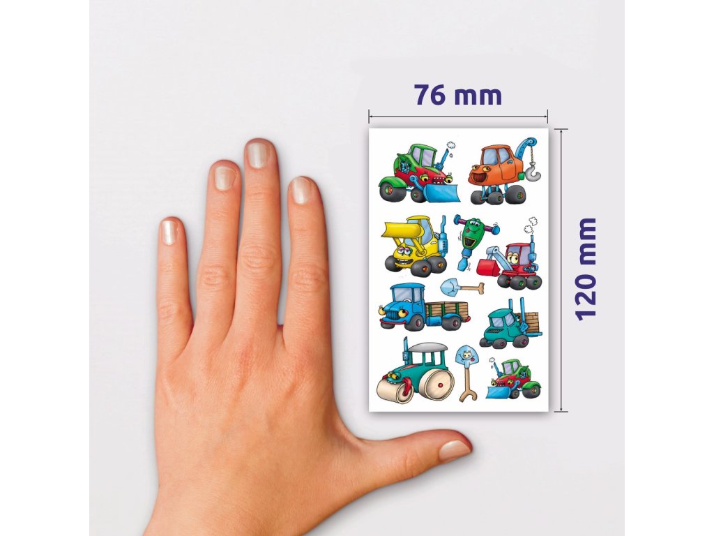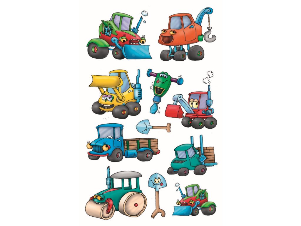 33 ks samolepek v balení, papírové, permanentní lepidlo, motiv stavební stroje. Balení obsahuje 3 stejné aršíky vyobrazených samolepek.