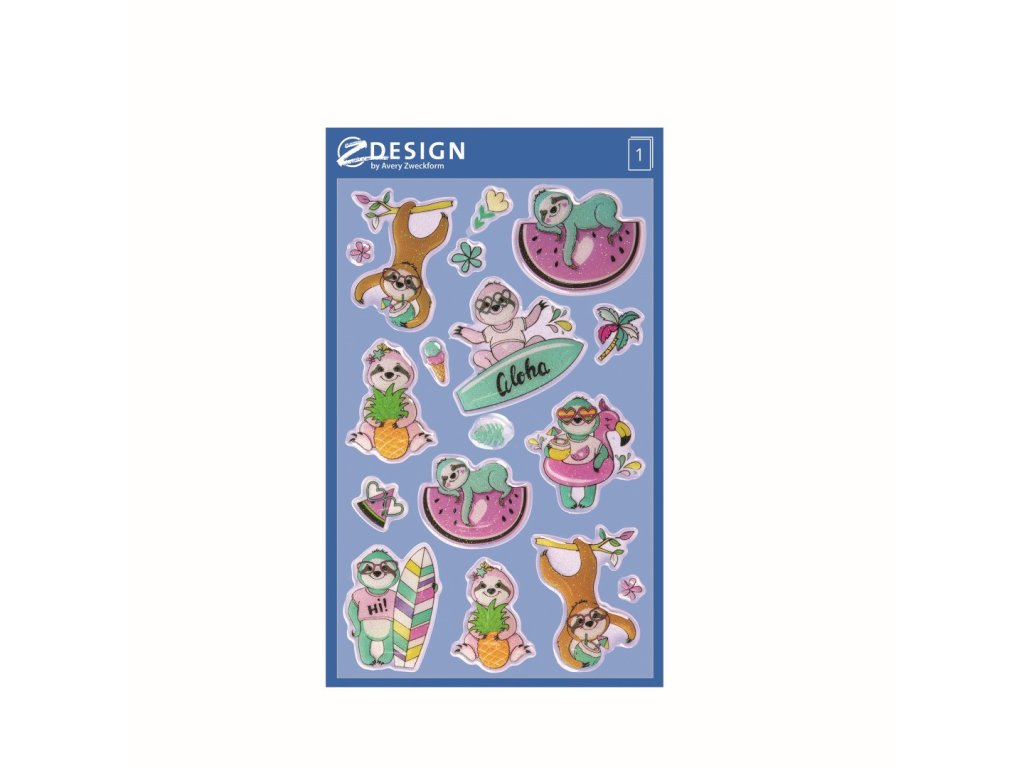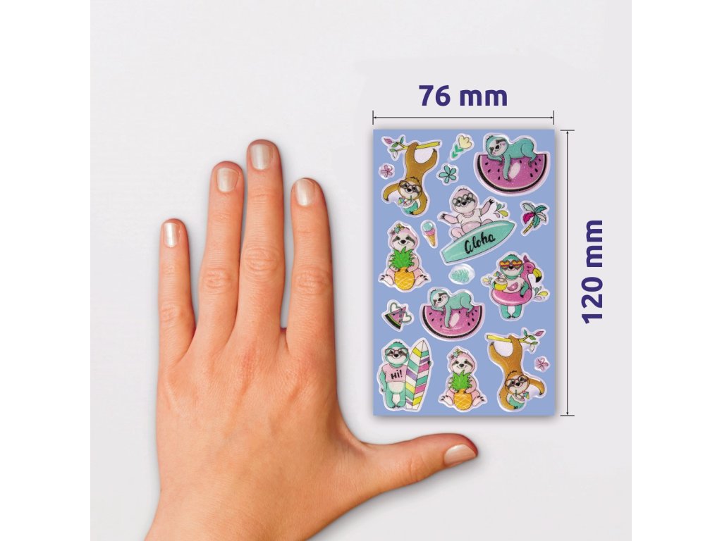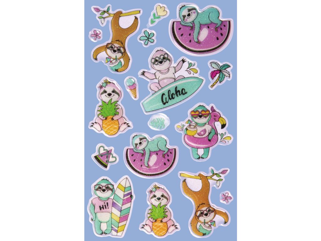 15 ks samolepek v balení, umělá pryskyřice, 3D efekt, permanentní lepidlo, motiv lenochodi. Balení obsahuje 1 aršík vyobrazených samolepek.