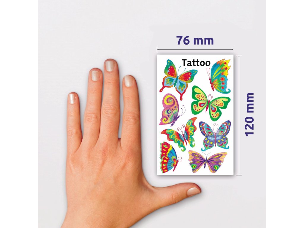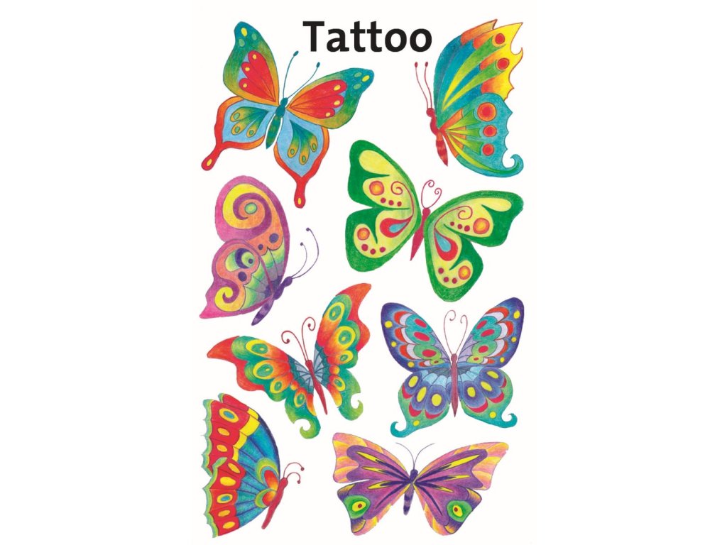 8 ks tetování v balení, tetovací fólie, motiv motýli. Dočasné, nedráždivé, voděodolné tetování na kůži. Balení obsahuje 1 aršík vyobrazených tetování.