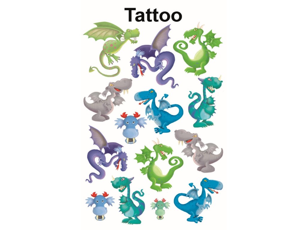 14 ks tetování v balení, tetovací fólie, motiv dráčci. Dočasné, nedráždivé, voděodolné tetování na kůži. Balení obsahuje 1 aršík vyobrazených tetování.