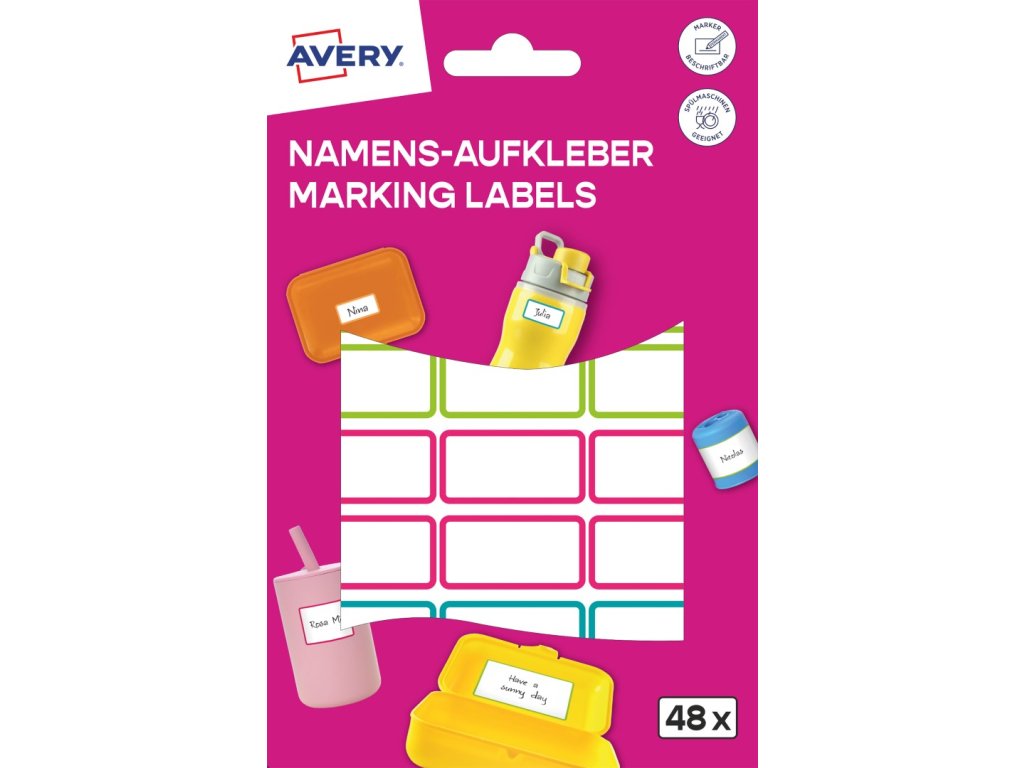 Odolné samolepicí štítky Avery Zweckform NAME48C o rozměru 31 x 15 mm slouží k přehlednému označování veškerých školních potřeb, krabiček na svačinu, lahví na pití a dalších předmětů ve školách a školkách — bez použití tiskárny. Označení provedete během několika vteřin: jednoduše napište jméno, třídu či adresu permanentním popisovačem, nechte krátce zaschnout a přilepte. Tyto bílé fóliové štítky s barevnými rámečky se díky silnému permanentnímu lepidlu snadno přizpůsobí i zaobleným tvarům a pevně drží na nejrůznějších površích. Jsou voděodolné a vhodné do myčky na nádobí, takže označení vydrží i časté mytí.
