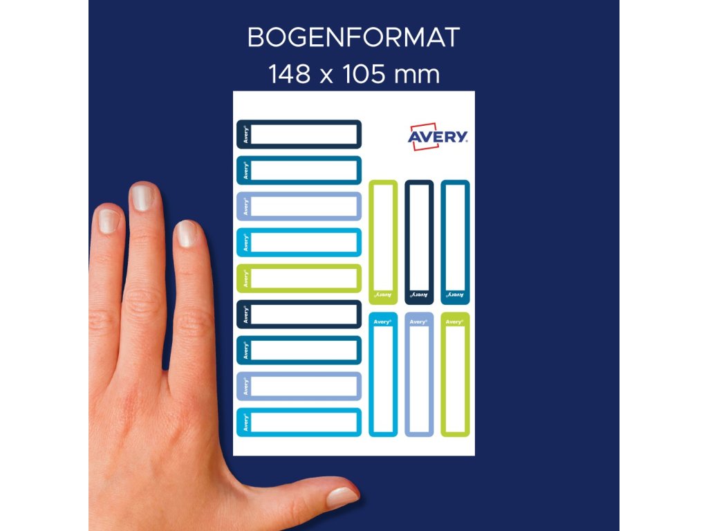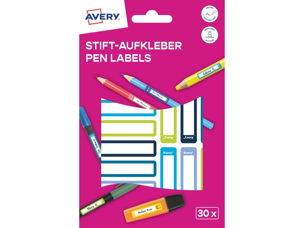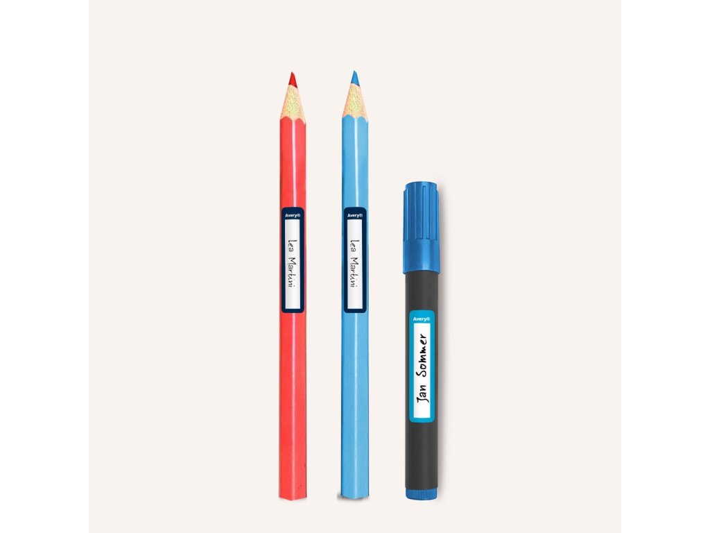 Samolepicí štítky Avery Zweckform RESMI30G o rozměru 50 x 10 mm slouží k přehlednému označování psacích per, tužek, štětců a dalších drobných školních a herních pomůcek ve školách a školkách — bez použití tiskárny. Označení provedete během několika vteřin: jednoduše napište jméno a třídu permanentním popisovačem nebo kuličkovým perem, nechte krátce zaschnout a přilepte. Tyto bílé papírové štítky s barevnými rámečky se díky silnému permanentnímu lepidlu snadno přizpůsobí i zaobleným tvarům a pevně drží na nejrůznějších površích.