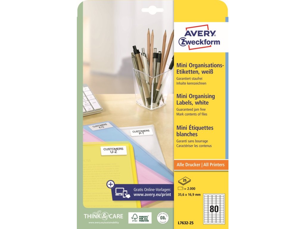 Potisknutelné mini etikety na složky Avery Zweckform L7632-25 o rozměru 35,6 x 16,9 mm pro přehledné značení ve výrobě, obchodě i kanceláři. Ideální pro označování a organizaci dokumentů, složek, organizérů, zásuvek. Tyto bílé papírové etikety s permanentním lepidlem mají vysokou a stálou lepivost na běžných površích jako je papír, karton, sklo nebo plast.