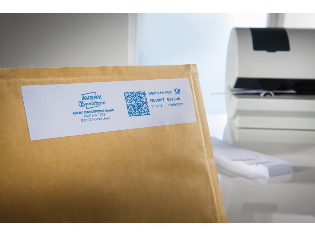Frankovací etikety Avery Zweckform 3440 o rozměru 163 x 43 mm jsou poštovně schválené a optimalizované pro rychlý a bezpečný tisk na frankovacích strojích značek Francotyp-Postalia (modely Optimail, optimail 30, T1000, EFS, jetmail, ultimail, PostBase, mymail, PostBase Mini), Neopost (modely IJ-10, IJ-25, IS-330, IS-350), Pitney Bowes (modely 5610, 5630E, 6100, 6300, U561, 6200, E500-Serie, DM100, DM50, PersonalPost), Stielow (modely Portostar 2205, 5505, 7000, 7150, 7156, 5400, 5460) a Frama (modely EcoMail, OfficeMail, Sensonic2000). Jsou ideální pro nepřímé frankování dopisů, zásilek, balíčků a firemní korespondence. Speciální absorpční papír zajišťuje čistý, ostrý tisk, který je okamžitě odolný proti rozmazání. V naší nabídce naleznete také další rozměry frankovacích etiket Avery Zweckform.