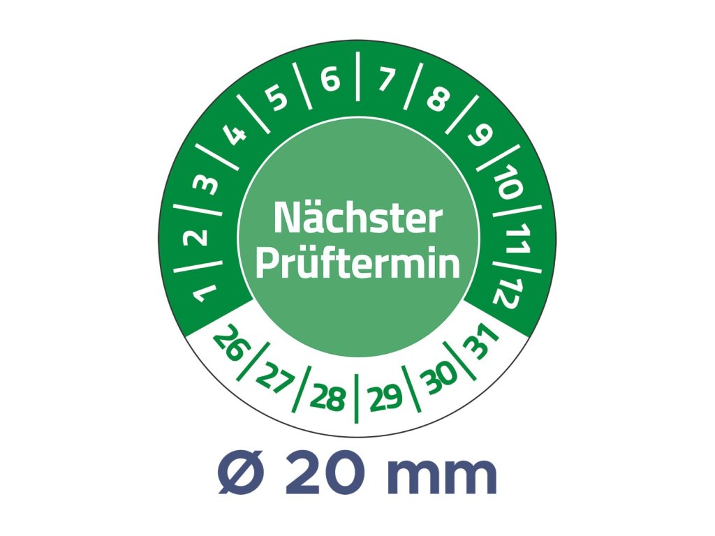Předtištěné vinylové samolepicí štítky Avery Zweckform 6987-2026 o průměru 20 mm s nápisem Nächster Prüftermin, čísly měsíců 1–12 a letopočty 2026-2031 jsou ideální jako revizní, inspekční nebo kontrolní plomby. Umožňují snadno zaznamenat měsíc a rok revize – popisem permanentním popisovačem nebo označením pomocí děrovacích kleští. Štítky jsou přehledné, mezinárodně srozumitelné a umožňují rychlou identifikaci termínů revizí či údržby. Díky vysoké přilnavosti spolehlivě drží na různých površích a jsou vhodné pro vnitřní i venkovní použití. Tyto zelené vinylové etikety s permanentním lepidlem jsou odolné vůči vodě, oleji, rozpouštědlům, čisticím a dezinfekčním prostředkům a teplotám od −20 °C do +80 °C.