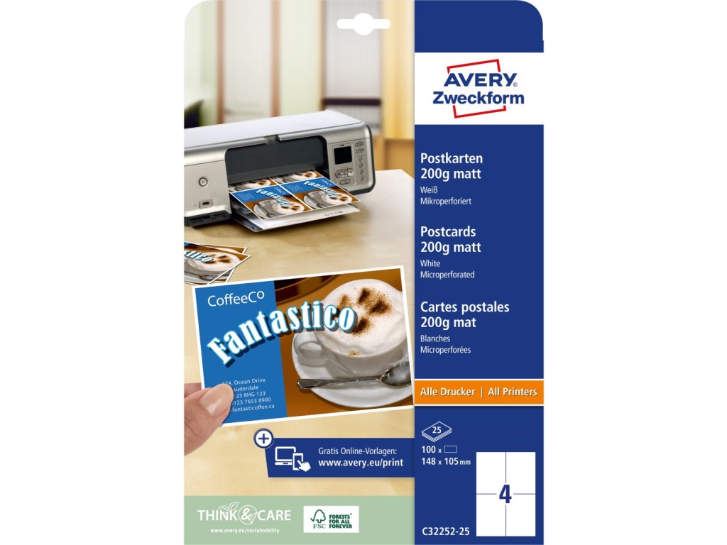 Papírové štítky Avery Zweckform C32252-25 jsou vhodné na malosériový tisk jmenovek, pozvánek, blahopřání, korespondečních lístků apod. Praktické, oboustranně potisknutelné karty s vysokou gramáží pro různé způsoby použití v domácnosti, v obchodě nebo v kanceláři - vytvořte si je proto sami, podle Vašich představ, jednoduše z pohodlí domova nebo kanceláře. Hrany karet s velmi jemnou mikroperforací, díky které od sebe jednotlivé karty velice snadno oddělíte. Při tisku se můžete spolehnout na hladký průjezd archů tiskárnou bez uvíznutí a ostrý tiskový výstup, který se díky vynikajícímu ukotvení tonerového prášku nebo inkoustu nerozmazává. Potisknutelné papírové štítky Avery C32252-25 jsou vhodné pro všechny běžné laserové i inkoustové tiskárny a hodí se i pro ruční popis. Přesný rozměr pro sady jmenovek Avery 4834, 4834XL a 4839XL.