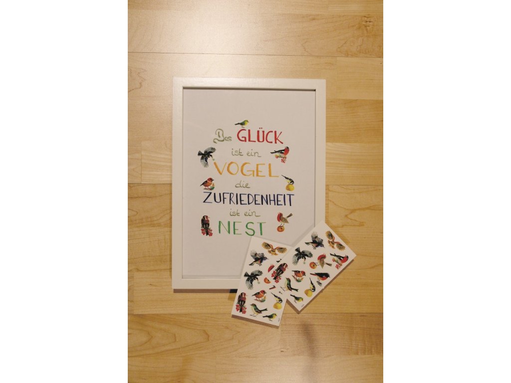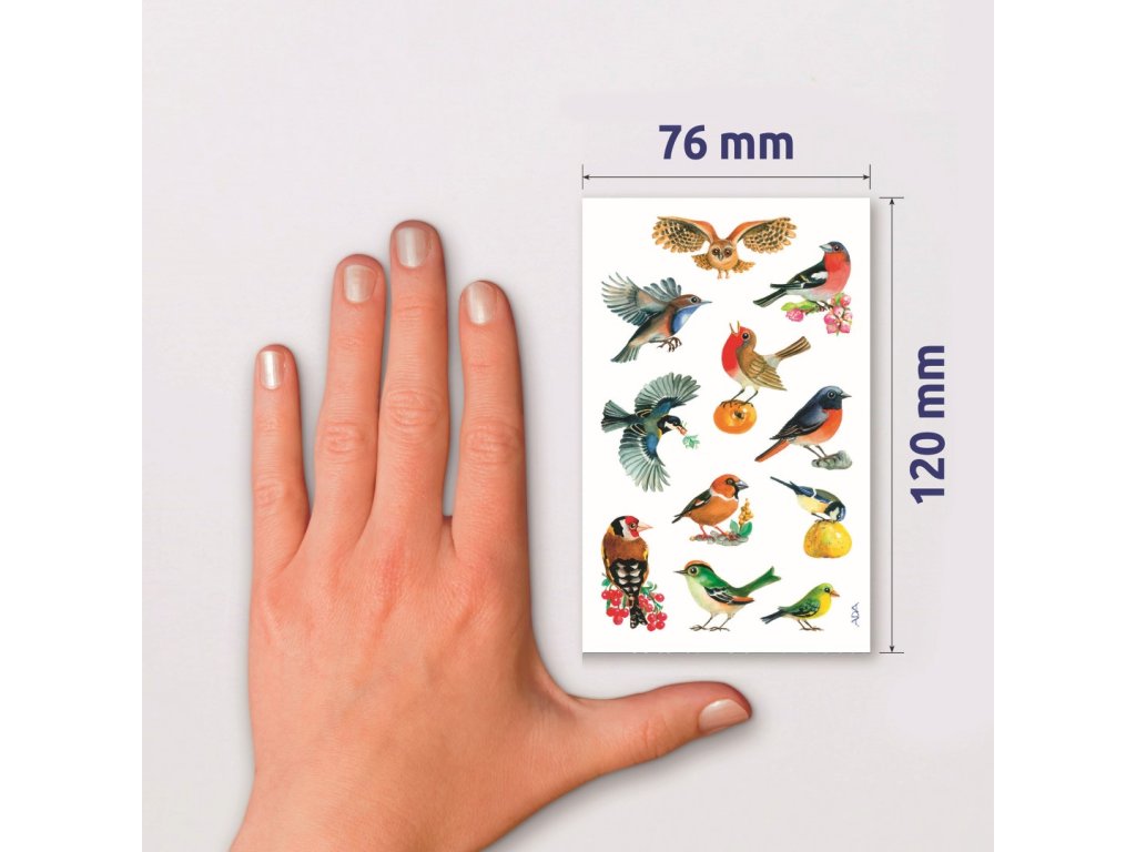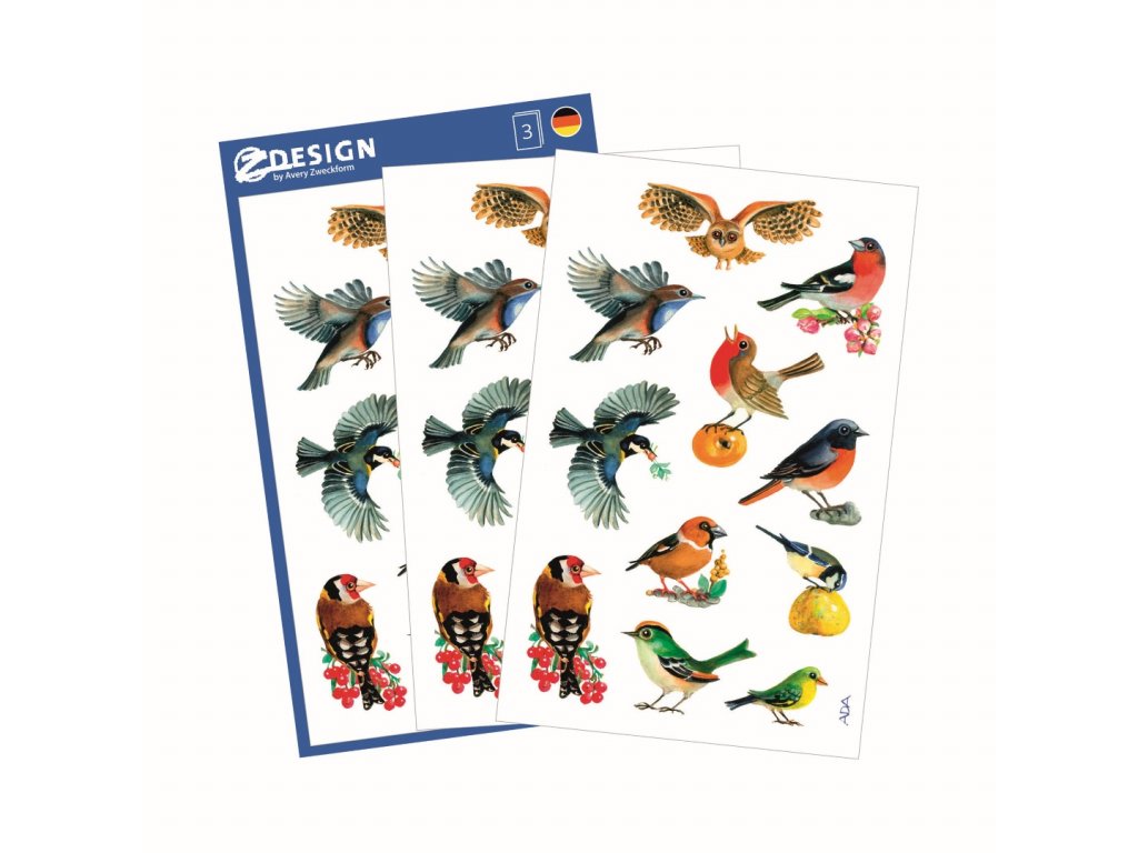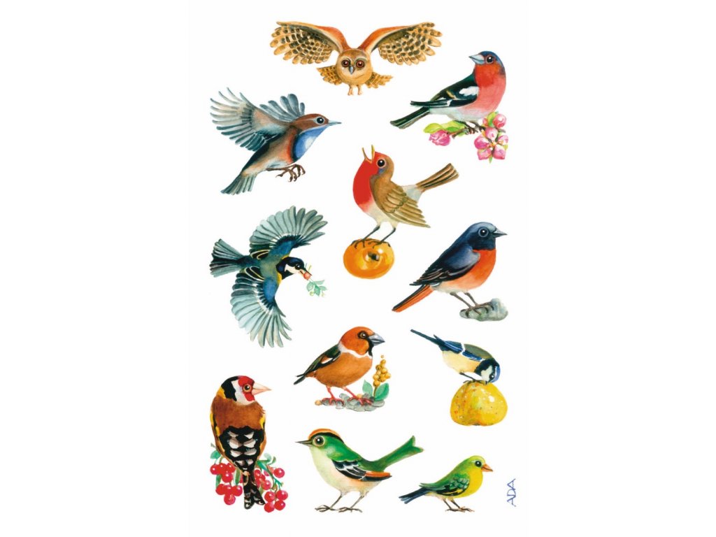 33 ks samolepek v balení, papírové, permanentní lepidlo, motiv ptáčci. Balení obsahuje 3 stejné aršíky vyobrazených samolepek.