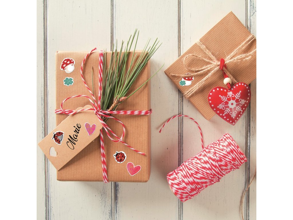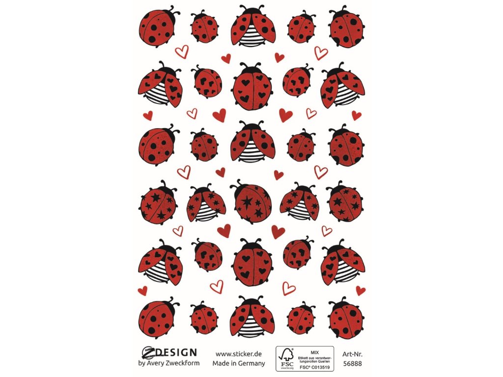 52 ks samolepek v balení, papírové, permanentní lepidlo, motiv berušky. Balení obsahuje jeden aršík vyobrazených samolepek.
