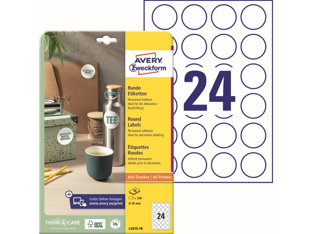 Kulaté etikety | Avery Zweckform L3415-10 + online software pro tisk etiket + tiskové šablony ke stažení zdarma