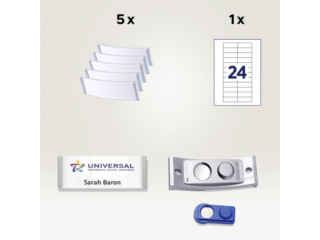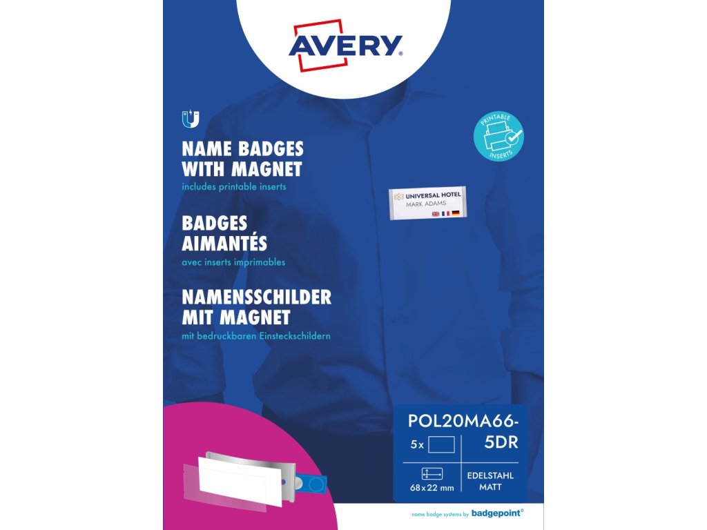Kompletní sada magnetických jmenovek Avery Zweckform POL20MA66-5DR je určena pro dlouhodobé profesionální používání v různých odvětvích – od zdravotnictví, gastronomie a hotelnictví až po obchodní služby, konference, semináře, veletrhy či firemní akce. Jmenovky využívají duální magnetický systém smag® od badgepoint®, tvořený dvěma magnety s opačnými póly, které se vzájemně uzamknou. Tento mechanismus zaručuje, že jmenovky pevně drží bez přetáčení či sklouzávání, aniž by došlo k poškození oděvu. Přední panel z akrylového skla odolného proti poškrábání dodává elegantní vzhled i vysokou odolnost. Štítky o rozměru 64 x 22 mm lze snadno měnit a potisknout na běžných laserových i inkoustových tiskárnách. K této sadě jsou k dispozici také náhradní potisknutelné papírové štítky ve stejném rozměru – objednací číslo DPC6422A-10.