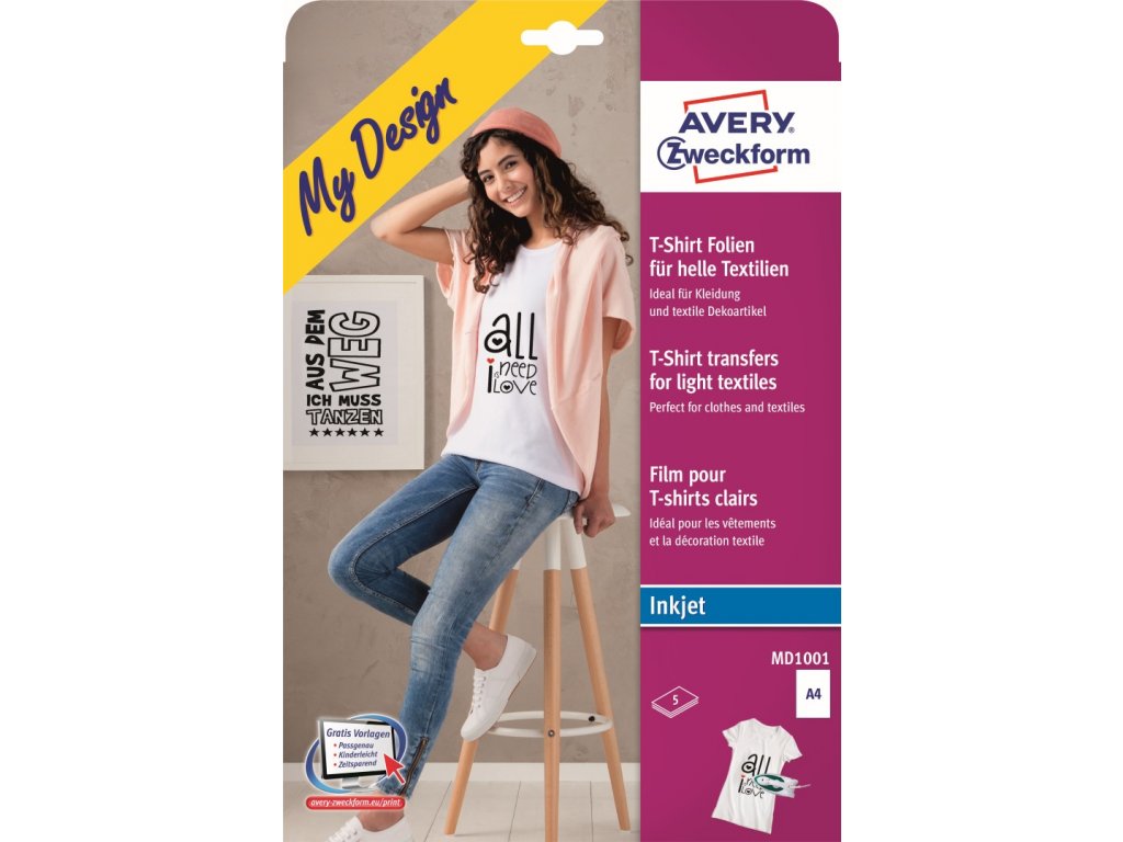 Nažehlovací přenosové fólie Avery Zweckform MD1001 jsou určeny pro všechny bavlněné textilie v bílých nebo světlých pastelových odstínech. Jsou ideální pro tvorbu originálních triček, polštářů, zástěr, ubrusů či dětského oblečení. Stačí si vybrat fotku, text nebo obrázek, případně vytvořit vlastní návrh v počítači a vytisknout jej na běžné inkoustové tiskárně. Motiv stačí jednoduše zažehlit na textil – potisk je odolný vydrží až 20 praní při teplotě 30 °C. Tyto fólie se často označují také jako přenosový papír na textil nebo žehlicí papír pro Inkjet tiskárny.