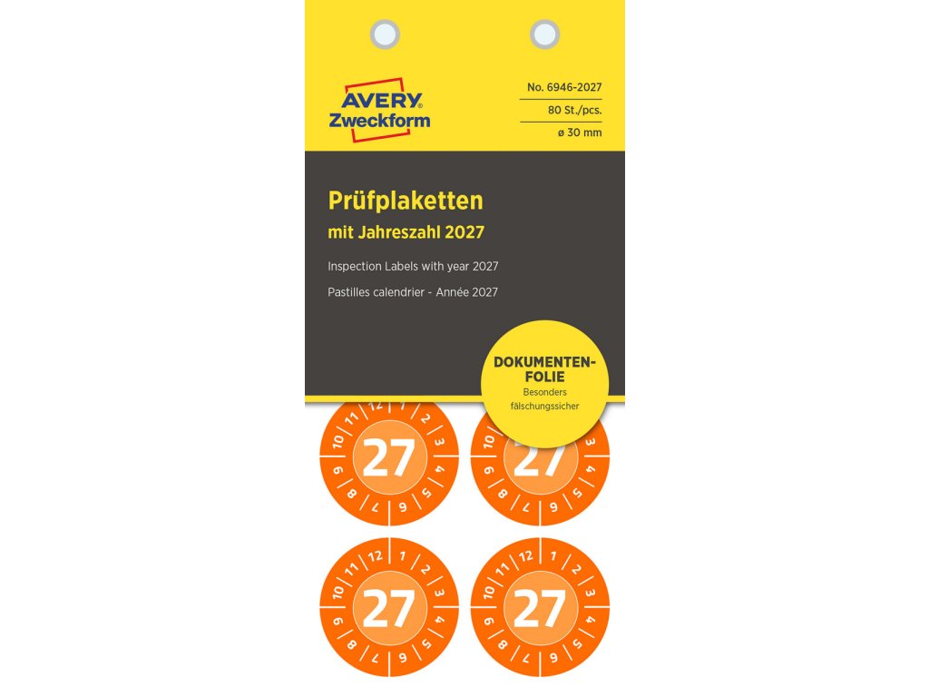 Předtištěné neodlepitelné akrylové štítky Avery Zweckform 6946-2027 o průměru 30 mm s čísly měsíců 1–12 a letopočtem 2027 jsou ideální jako revizní, inspekční nebo kontrolní plomby. Umožňují snadno zaznamenat měsíc a rok revize – popisem permanentním popisovačem nebo označením pomocí děrovacích kleští. Štítky jsou přehledné, mezinárodně srozumitelné a umožňují rychlou identifikaci termínů revizí či údržby. Pokus o neoprávněné odstranění je ihned viditelný – materiál se při odlepování rozpadne a etiketu lze sejmout pouze po malých částech. Tyto oranžové akrylové etikety s permanentním lepidlem jsou odolné vůči vodě, oleji, rozpouštědlům, čisticím a dezinfekčním prostředkům.
