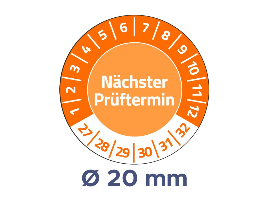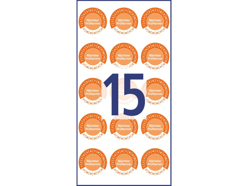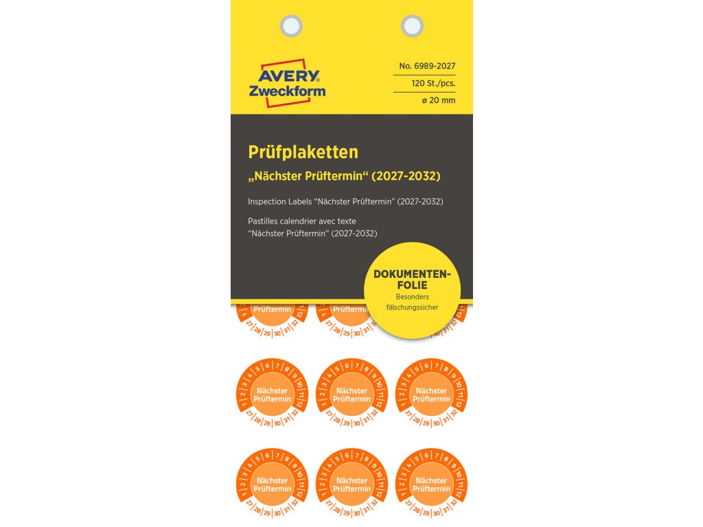 Předtištěné neodlepitelné akrylové štítky Avery Zweckform 6989-2027 o průměru 20 mm s nápisem Nächster Prüftermin, čísly měsíců 1–12 a letopočty 2027-2032 jsou ideální jako revizní, inspekční nebo kontrolní plomby. Umožňují snadno zaznamenat měsíc a rok revize – popisem permanentním popisovačem nebo označením pomocí děrovacích kleští. Štítky jsou přehledné, mezinárodně srozumitelné a umožňují rychlou identifikaci termínů revizí či údržby. Pokus o neoprávněné odstranění je ihned viditelný – materiál se při odlepování rozpadne a etiketu lze sejmout pouze po malých částech. Tyto oranžové akrylové etikety s permanentním lepidlem jsou odolné vůči vodě, oleji, rozpouštědlům, čisticím a dezinfekčním prostředkům.