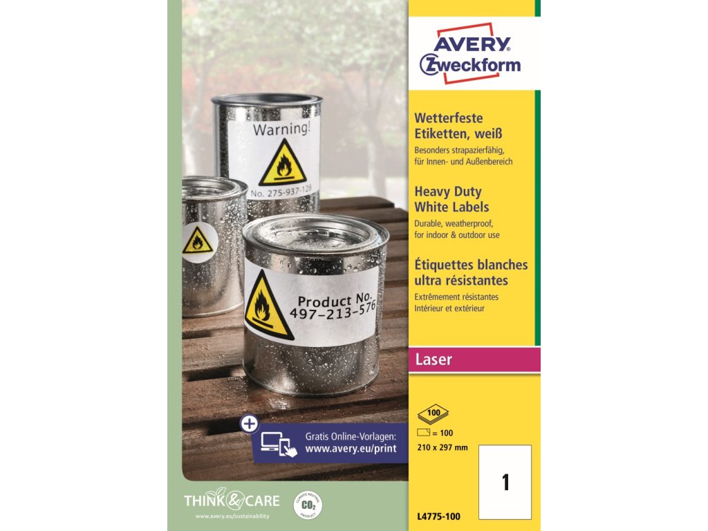 Odolné samolepicí štítky Avery Zweckform L4775-100 o rozměru 210 x 297 mm jsou určeny do náročných vnitřních i venkovních podmínek. Jsou ideální pro trvalé a dlouhodobé značení majetku, výrobků, skladových regálů, palet, zařízení či nářadí. Díky vysoké a stálé lepivosti spolehlivě drží na většině běžných povrchů. Tyto bílé polyesterové etikety (PET) s permanentním lepidlem jsou odolné vůči stříkající vodě, nečistotám, olejům, mastnotě, roztržení, UV záření a teplotám od -20 °C do +80 °C.