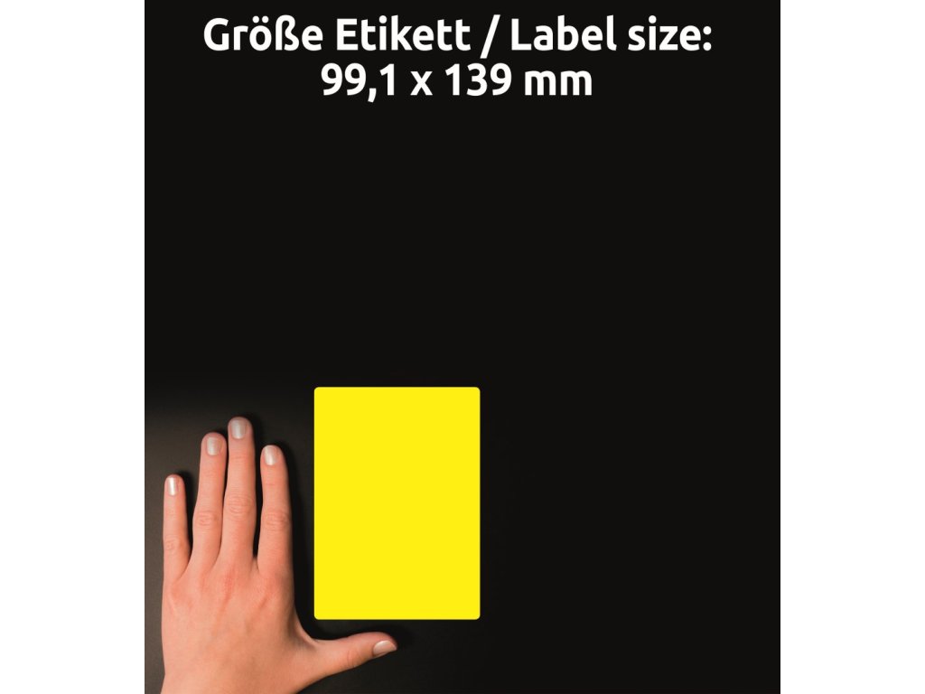 Odolné samolepicí štítky Avery Zweckform L6127-20 o rozměru 99,1 x 139 mm jsou určeny do náročných vnitřních i venkovních podmínek. Jsou ideální pro trvalé a dlouhodobé značení majetku, výrobků, skladových regálů, palet, zařízení či nářadí. Díky vysoké a stálé lepivosti spolehlivě drží na většině běžných povrchů. Tyto žluté polyesterové etikety (PET) s permanentním lepidlem jsou odolné vůči stříkající vodě, nečistotám, olejům, mastnotě, roztržení, UV záření a teplotám od -20 °C do +80 °C.