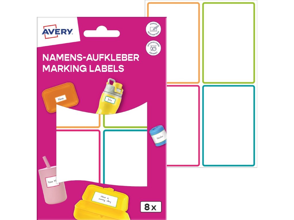 Odolné samolepicí štítky Avery Zweckform NAME8C jsou ideální pro označování veškerých školních věcí, krabiček na svačinu, lahví na pití a mnoha dalších předmětů ve školách a školkách. Na etiketu jednoduše napište jméno, třídu nebo adresu pomocí permanentního popisovače, nechte krátce zaschnout a přilepte. Měkký materiál z odolné fólie se přizpůsobí i zaobleným tvarům a díky silnému lepidlu spolehlivě a pevně drží na nejrůznějších površích. Každou položku lze označit doslova během několika vteřin. Odolné etikety na označování Avery NAME8C jsou voděodolné a vhodné i do myčky na nádobí.