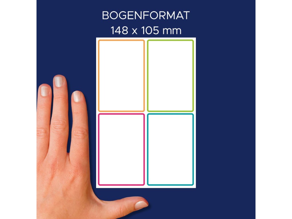 rozměr 68x46 mm, 8 ks etiket v balení, odolná fólie, permanentní lepidlo, motiv barevné rámečky.