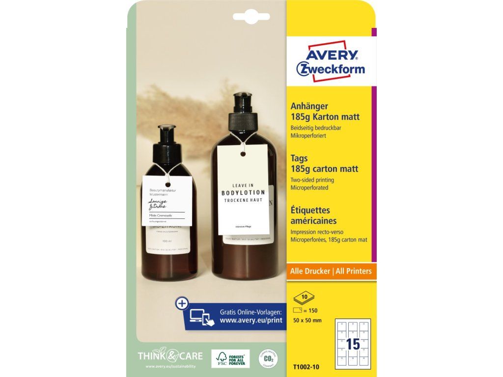 Potisknutelné visačky Avery Zweckform T1002-10 z bílého kartonu. Ideální pro malé firmy, drobné výrobce a obchodníky na označování výrobků, např. kosmetiky, nápojů, potravin a textilu, jako závěsné visačky pro veškeré informace o výrobku nebo cenovky, závěsné štítky pro označování oděvů v módním průmyslu, pro soukromé použití v domácnosti jako dárkové štítky, jmenovky apod. Hrany visaček mají velmi jemnou mikroperforací, díky které od sebe jednotlivé visačky velice snadno oddělíte. Tyto visačky lze potisknout z obou stran, čímž vzniká více prostoru pro doplňkové informace jako například mapku s vyznačením místa Vašeho podnikání, provozní dobu, firemní slogan atd. Při tisku se můžete spolehnout na plynulý průjezd archů tiskárnou bez uvíznutí a ostrý tiskový výstup, který se díky vynikajícímu ukotvení tonerového prášku nebo inkoustu nerozmazává. Oboustranně potisknutelné přívěsky Avery T1002-10 jsou vhodné pro všechny běžné laserové i inkoustové tiskárny, kopírovací stroje a hodí se i pro ruční popis.