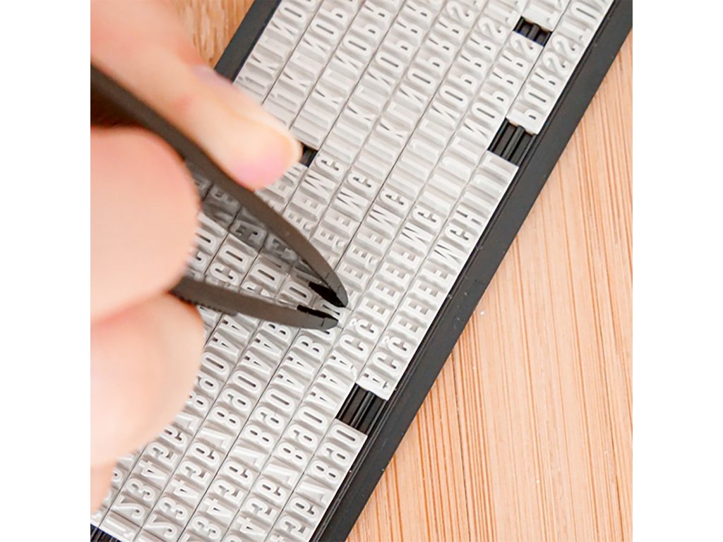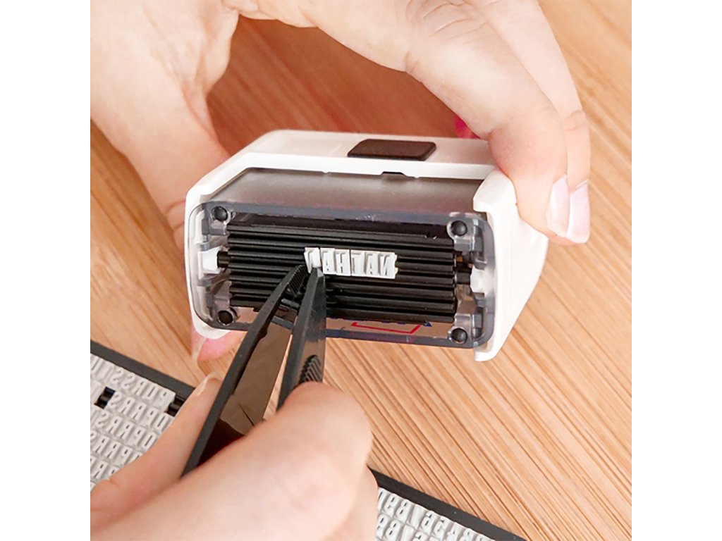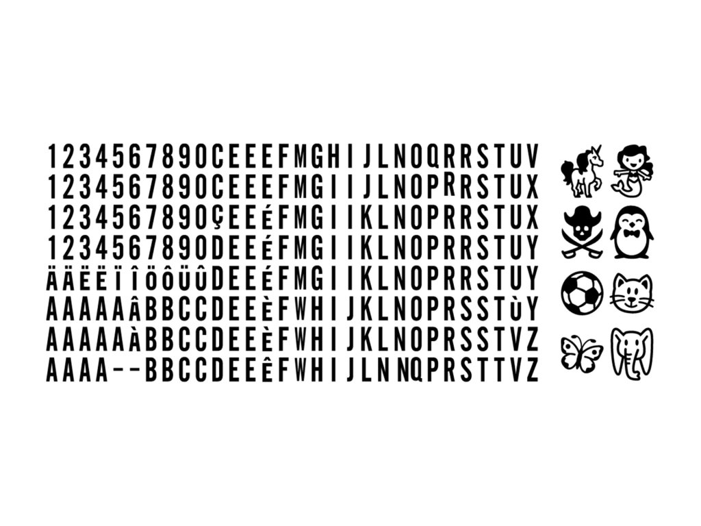 Sada obsahuje: razítko, kazetu s černou, netoxickou a dermatologicky testovanou barvou, 288 ks písmen, číslic a znaků, pinzetu a nažehlovací proužek na tmavé textilie. Na razítku lze nastavit až 3 řádky po 15 znacích (výška 4 mm).