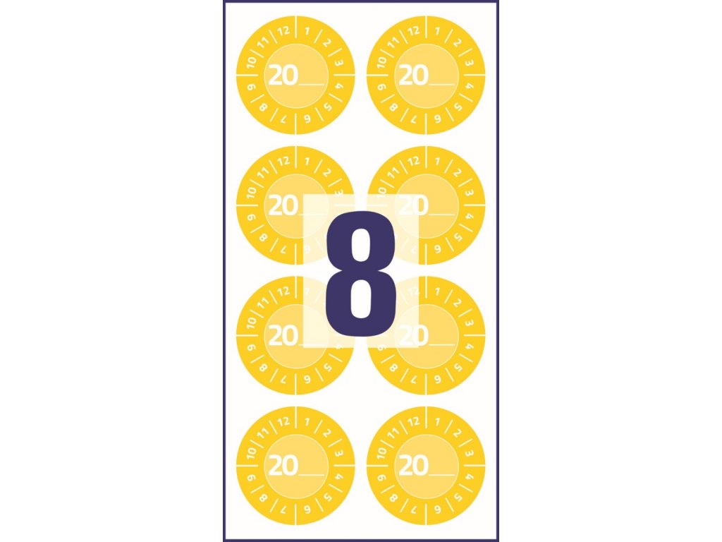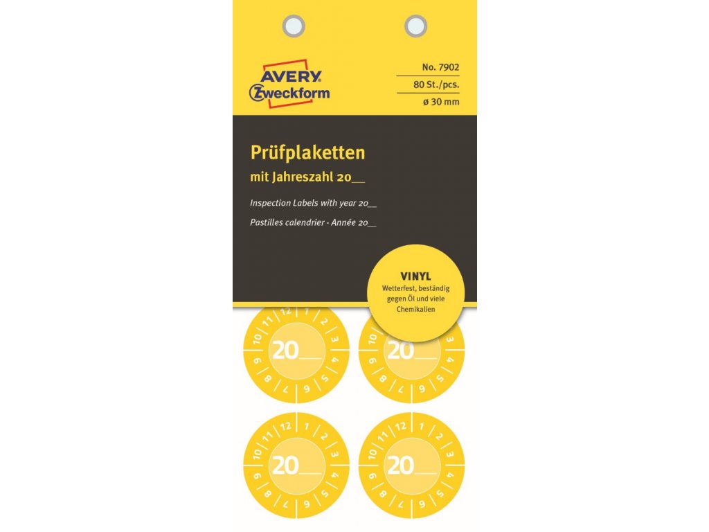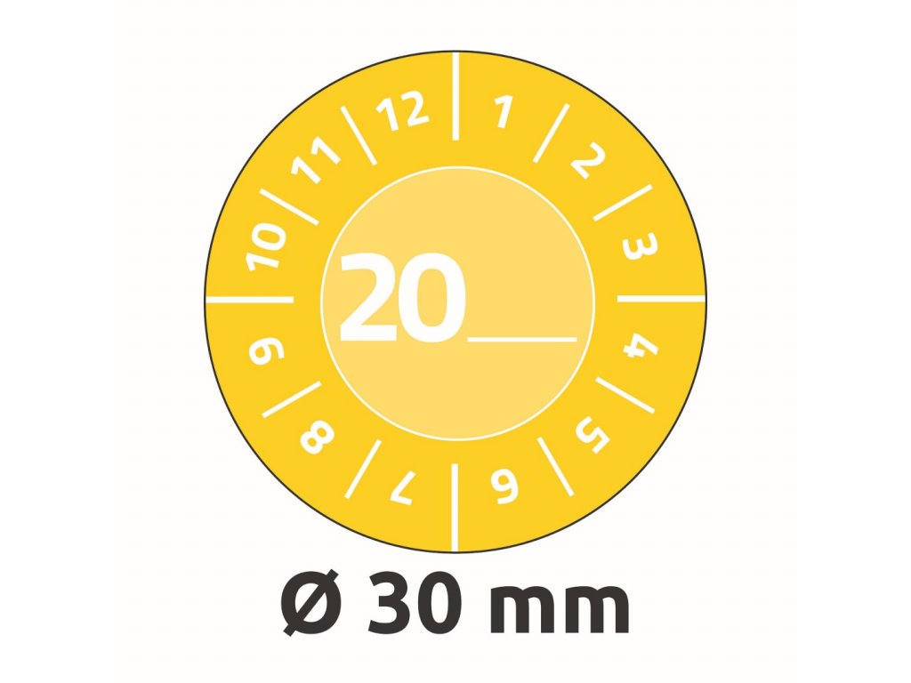 Předtištěné vinylové samolepicí štítky Avery Zweckform 7902 o průměru 30 mm s čísly měsíců 1–12 a volitelným letopočtem 20__ jsou ideální jako revizní, inspekční nebo kontrolní plomby. Umožňují snadno zaznamenat měsíc a rok revize – popisem permanentním popisovačem nebo označením pomocí děrovacích kleští. Štítky jsou přehledné, mezinárodně srozumitelné a umožňují rychlou identifikaci termínů revizí či údržby. Díky vysoké přilnavosti spolehlivě drží na různých površích a jsou vhodné pro vnitřní i venkovní použití. Tyto žluté vinylové etikety s permanentním lepidlem jsou odolné vůči vodě, oleji, rozpouštědlům, čisticím a dezinfekčním prostředkům a teplotám od −20 °C do +80 °C.