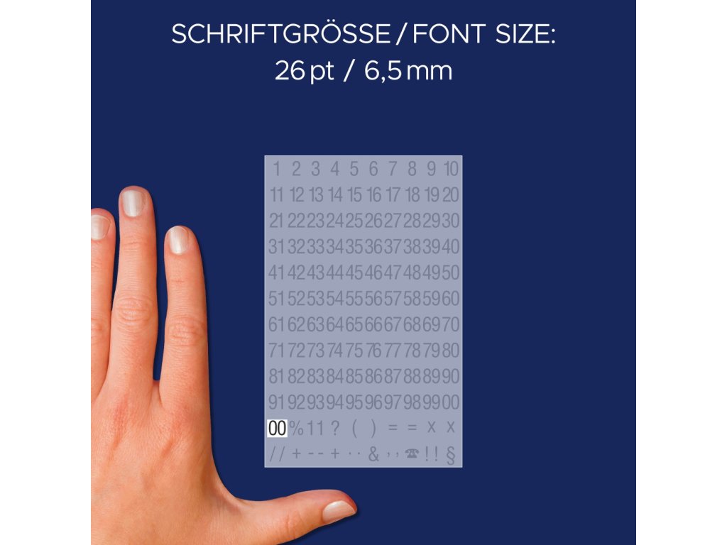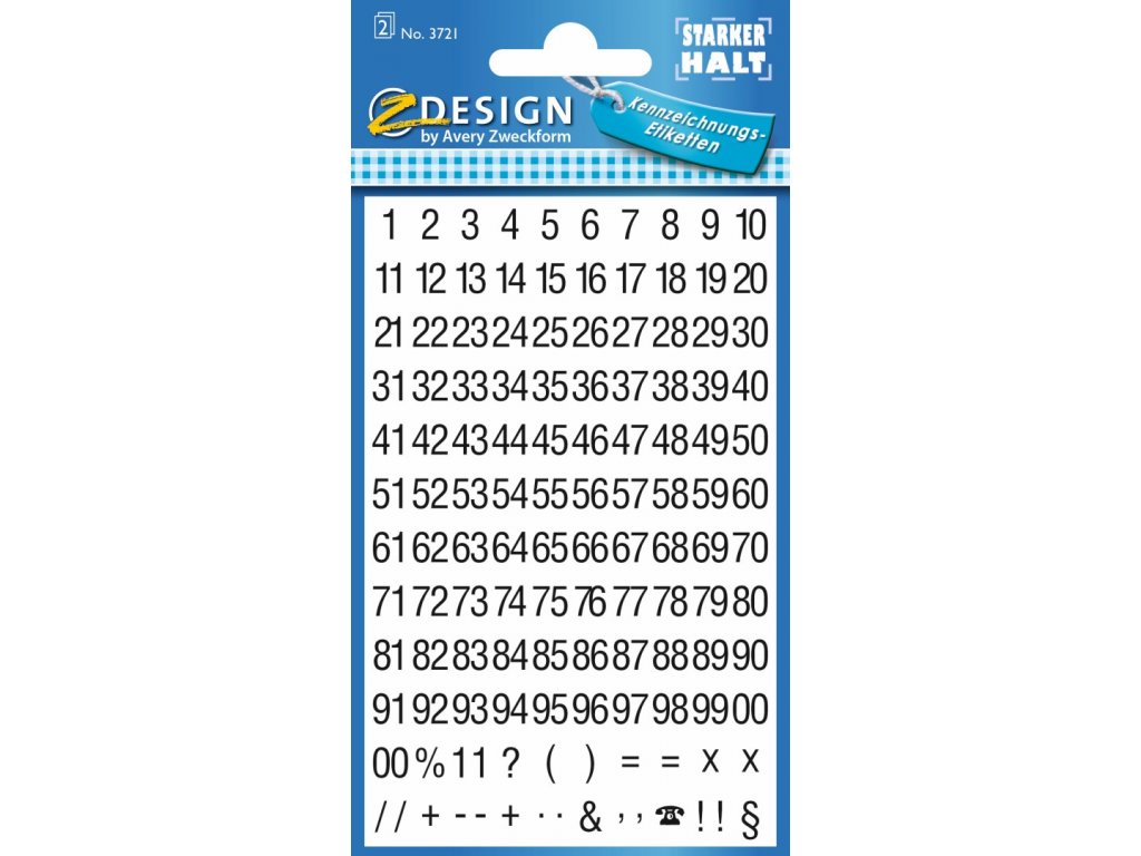 Samolepicí číslice Avery Zweckform 3721 jsou určeny pro rychlé, čisté a trvanlivé označování nejrůznějších předmětů v interiéru i exteriéru. Tyto černé číslice jsou natištěny na bílé, vysoce odolné fólii obdélníkového tvaru, která díky silnému permanentnímu lepidlu spolehlivě drží na nejrůznějších površích. Jejich hlavní výhodou je plná odolnost vůči povětrnostním vlivům, díky čemuž zůstávají dobře čitelné i při dlouhodobém venkovním použití. Jsou vhodné pro označení schránek, dveří, skladových pozic, vybavení, nářadí a různých domácích i kancelářských potřeb. Jednotlivé číslice jsou ve fontu Condensed Helvetica 26 pt s výškou 6,5 mm. Avery Zweckform jako dlouholetý specialista na samolepicí etikety nabízí široký výběr písmen a číslic v různých barvách a velikostech.