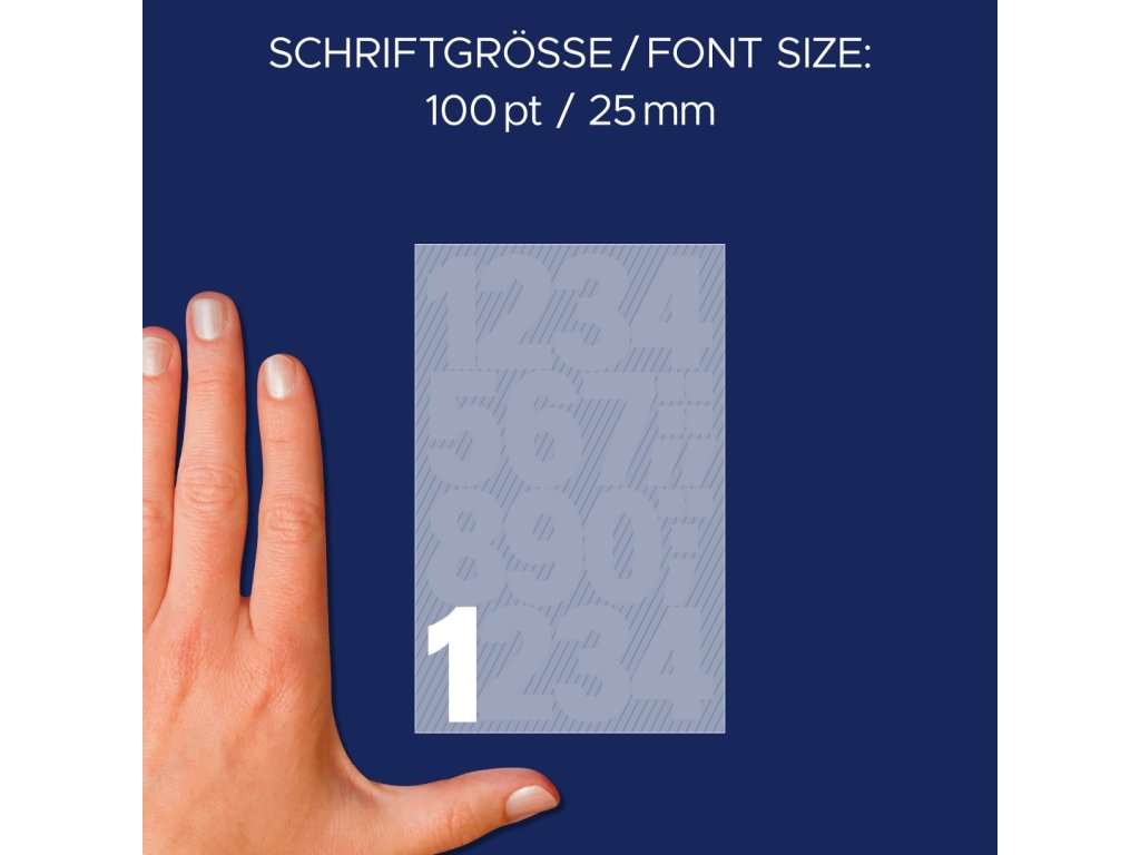 Samolepicí číslice Avery Zweckform 3787 jsou určeny pro rychlé, čisté a trvanlivé označování nejrůznějších předmětů v interiéru i exteriéru. Tyto bílé číslice jsou vyřezané z vysoce odolné fólie a díky silnému permanentnímu lepidlu spolehlivě drží na nejrůznějších površích. Jejich hlavní výhodou je plná odolnost vůči povětrnostním vlivům, díky čemuž zůstávají dobře čitelné i při dlouhodobém venkovním použití. Jsou vhodné pro označení schránek, dveří, skladových pozic, vybavení, nářadí a různých domácích i kancelářských potřeb. Jednotlivé číslice jsou ve fontu Univers Bold 100 pt s výškou 25 mm. Avery Zweckform jako dlouholetý specialista na samolepicí etikety nabízí široký výběr písmen a číslic v různých barvách a velikostech.
