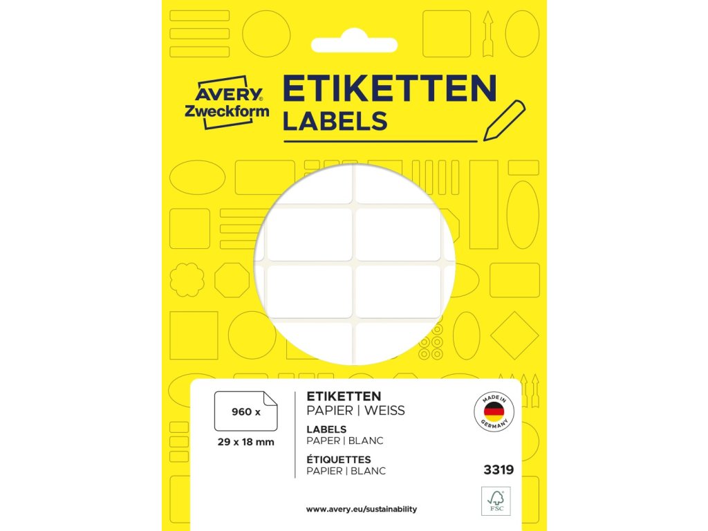 Samolepicí štítky na ruční popis Avery Zweckform 3319 o rozměru 29 x 18 mm jsou ideální pro rychlé, jednoduché a přehledné značení bez použití tiskárny. Tyto bílé papírové etikety s permanentním lepidlem lze snadno popisovat tužkou, propiskou nebo fixem a skvěle se hodí pro kancelář, obchod i domácnost. Spolehlivě drží na všech běžných typech povrchů. V naší nabídce naleznete také další rozměry a velikosti balení těchto oblíbených etiket.