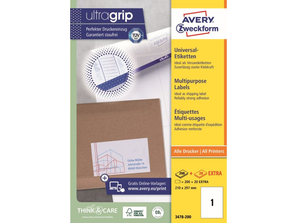 Samolepicí štítky Avery Zweckform 3478-200 o rozměru 210 x 297 mm zajistí spolehlivé a široké využití v kanceláři, obchodě i domácnosti. Tyto klasické bílé papírové etikety s permanentním lepidlem mají vysokou a stálou lepivost na běžných površích, jako je papír, karton, sklo nebo plast. Jsou ideální pro rychlý a bezproblémový potisk na všech běžných typech laserových a inkoustových tiskáren. V naší nabídce naleznete mnoho dalších rozměrů univerzálních etiket Avery Zweckform, které jsou k dispozici v různých velikostech balení.