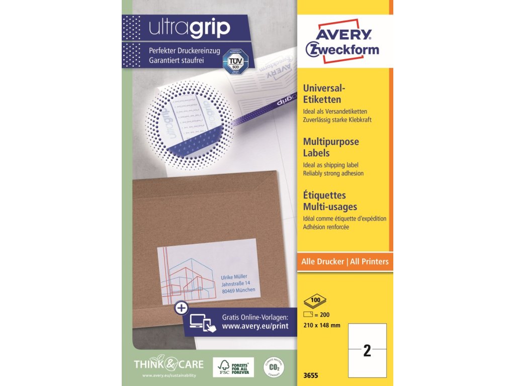 Samolepicí štítky Avery Zweckform 3655 o rozměru 210 x 148 mm zajistí spolehlivé a široké využití v kanceláři, obchodě i domácnosti. Tyto klasické bílé papírové etikety s permanentním lepidlem mají vysokou a stálou lepivost na běžných površích, jako je papír, karton, sklo nebo plast. Jsou ideální pro rychlý a bezproblémový potisk na všech běžných typech laserových a inkoustových tiskáren. V naší nabídce naleznete mnoho dalších rozměrů univerzálních etiket Avery Zweckform, které jsou k dispozici v různých velikostech balení.