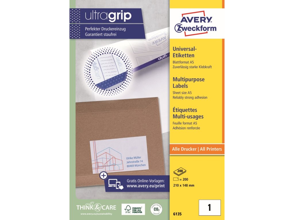 Samolepicí štítky Avery Zweckform na formátu A5 6135 o rozměru 210 x 148 mm zajistí spolehlivé a široké využití v kanceláři, obchodě i domácnosti. Tyto klasické bílé papírové etikety s permanentním lepidlem mají vysokou a stálou lepivost na běžných površích, jako je papír, karton, sklo nebo plast. Jsou ideální pro rychlý a bezproblémový potisk na všech běžných typech laserových a inkoustových tiskáren. V naší nabídce naleznete mnoho dalších rozměrů univerzálních etiket Avery Zweckform, které jsou k dispozici v různých velikostech balení.