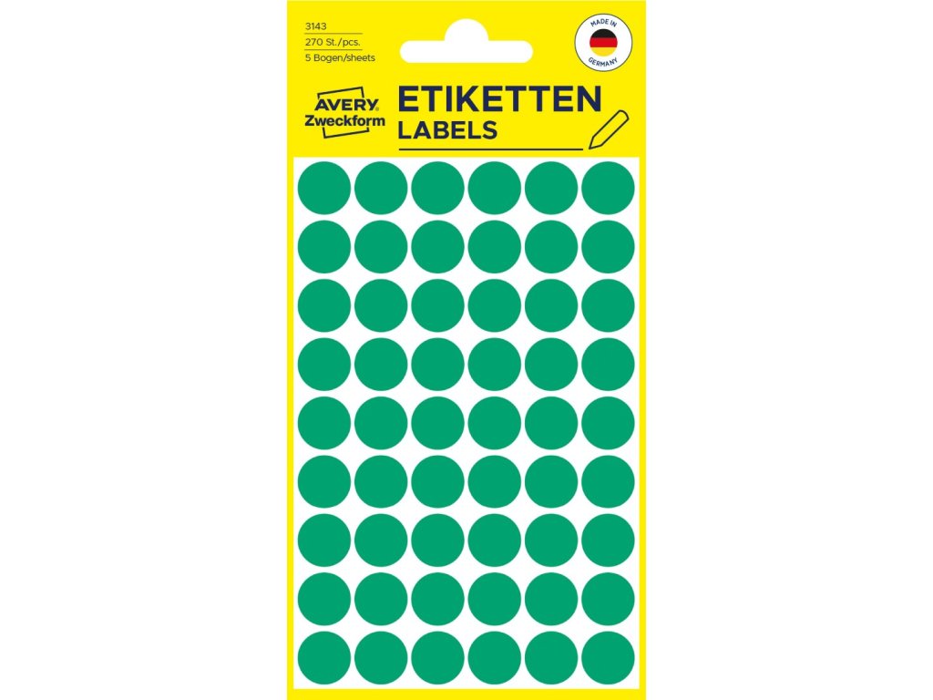 Kulaté značkovací etikety Avery Zweckform 3143 o průměru 12 mm jsou ideální pro rychlé a přehledné vizuální značení, plánování, třídění, organizaci a inventarizaci bez použití tiskárny. Tyto kulaté zelené papírové etikety s permanentním lepidlem lze snadno popisovat tužkou, propiskou nebo fixem a skvěle se hodí pro výrobu, obchod, kancelář i domácnost. Spolehlivě drží na všech běžných typech povrchů. Samolepicí kolečka nabízíme v různých barvách a velikostech, takže si snadno vyberete variantu, která vám bude nejlépe vyhovovat.