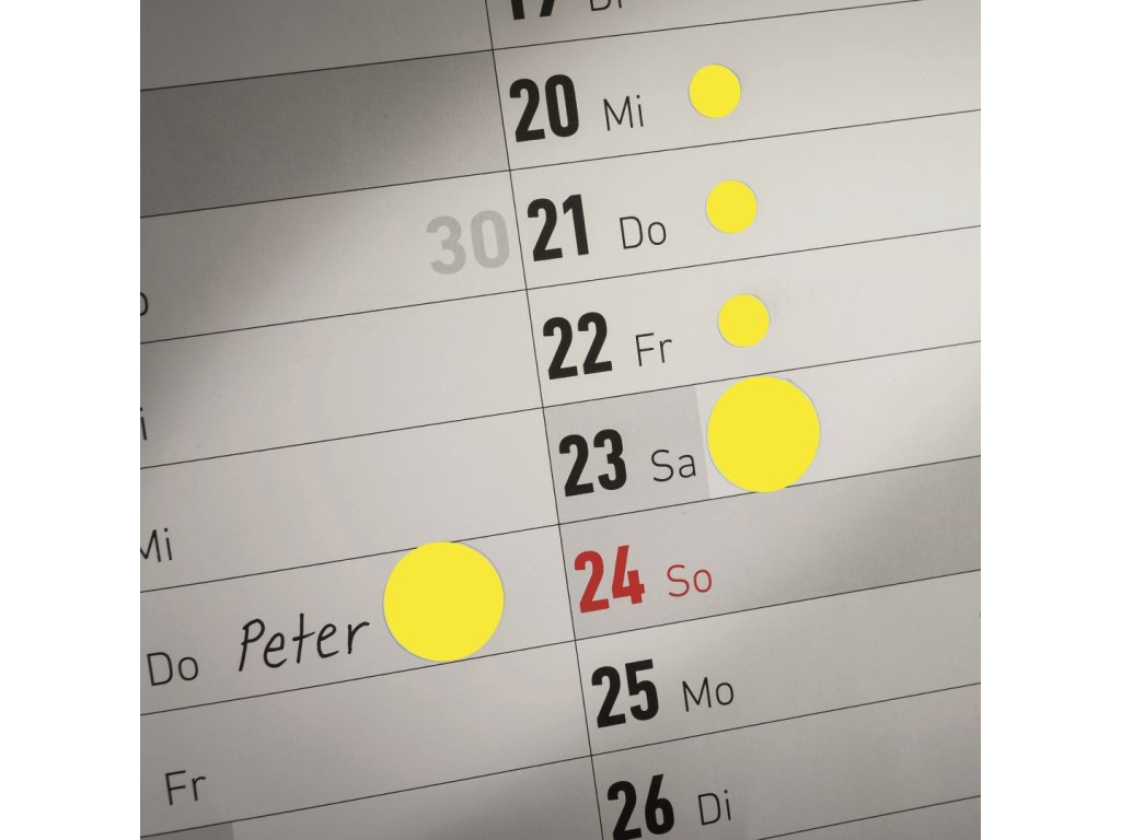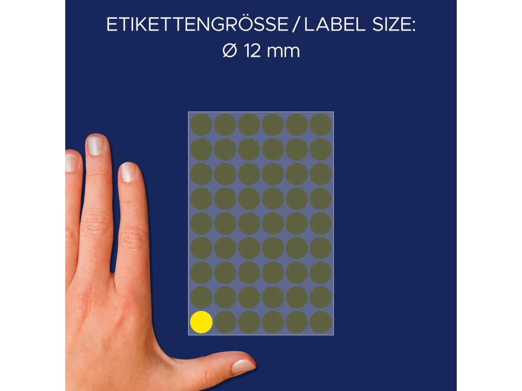 Kulaté značkovací etikety Avery Zweckform 3144 o průměru 12 mm jsou ideální pro rychlé a přehledné vizuální značení, plánování, třídění, organizaci a inventarizaci bez použití tiskárny. Tyto kulaté žluté papírové etikety s permanentním lepidlem lze snadno popisovat tužkou, propiskou nebo fixem a skvěle se hodí pro výrobu, obchod, kancelář i domácnost. Spolehlivě drží na všech běžných typech povrchů. Samolepicí kolečka nabízíme v různých barvách a velikostech, takže si snadno vyberete variantu, která vám bude nejlépe vyhovovat.