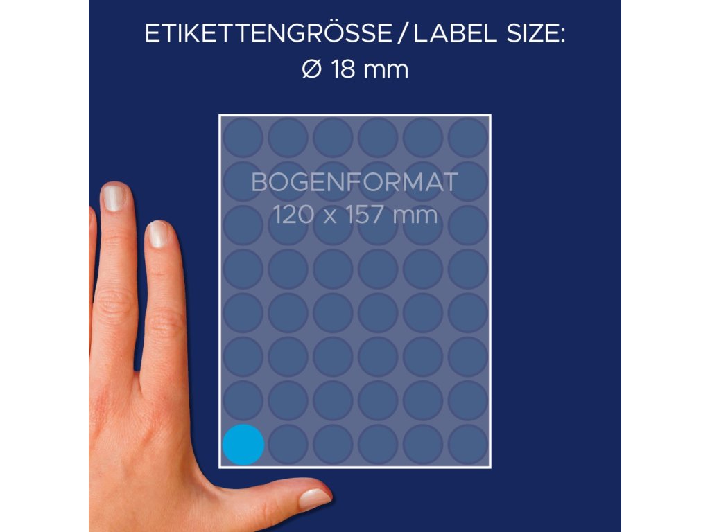 Kulaté značkovací etikety Avery Zweckform 3375 o průměru 18 mm jsou ideální pro rychlé a přehledné vizuální značení, plánování, třídění, organizaci a inventarizaci bez použití tiskárny. Tyto kulaté modré papírové etikety s permanentním lepidlem lze snadno popisovat tužkou, propiskou nebo fixem a skvěle se hodí pro výrobu, obchod, kancelář i domácnost. Spolehlivě drží na všech běžných typech povrchů. Samolepicí kolečka nabízíme v různých barvách a velikostech, takže si snadno vyberete variantu, která vám bude nejlépe vyhovovat.
