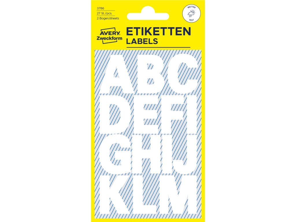 Samolepicí písmena Avery Zweckform 3786 jsou určena pro rychlé, čisté a trvanlivé označování nejrůznějších předmětů v interiéru i exteriéru. Tato bílá písmenka jsou vyřezaná z vysoce odolné fólie a díky silnému permanentnímu lepidlu spolehlivě drží na nejrůznějších površích. Jejich hlavní výhodou je plná odolnost vůči povětrnostním vlivům, díky čemuž zůstávají dobře čitelná i při dlouhodobém venkovním použití. Jsou vhodná pro označení schránek, dveří, skladových pozic, vybavení, nářadí a různých domácích i kancelářských potřeb. Jednotlivá písmena jsou ve fontu Univers Bold 100 pt s výškou 25 mm. Avery Zweckform jako dlouholetý specialista na samolepicí etikety nabízí široký výběr písmen a číslic v různých barvách a velikostech.
