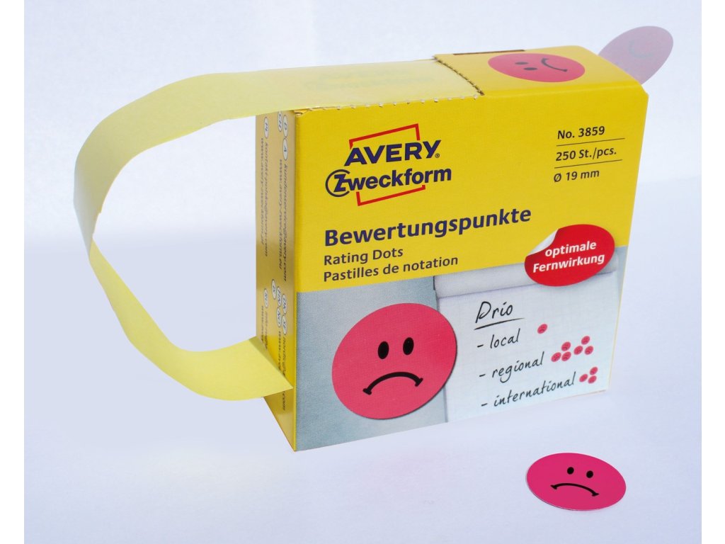 Samolepicí negativní (smutní) smajlíci na roli Avery Zweckform 3859 o průměru 19 mm jsou ideální pro rychlé vizuální hodnoticí nebo motivační značení bez použití tiskárny. Tyto kulaté červené papírové etikety s permanentním lepidlem se skvěle hodí pro školy a školky, kancelář i domácnost. Použijte je při hodnocení, hlasování, plánování, školní výuce nebo týmových schůzkách – kdekoliv, kde potřebujete jasnou vizuální zpětnou vazbu. Etikety spolehlivě drží na všech běžných typech povrchů. Praktický zásobník z pevného papíru zajišťuje snadnou manipulaci i skladování. Samolepicí kolečka nabízíme v různých barvách a velikostech, takže si snadno vyberete variantu, která vám bude nejlépe vyhovovat.