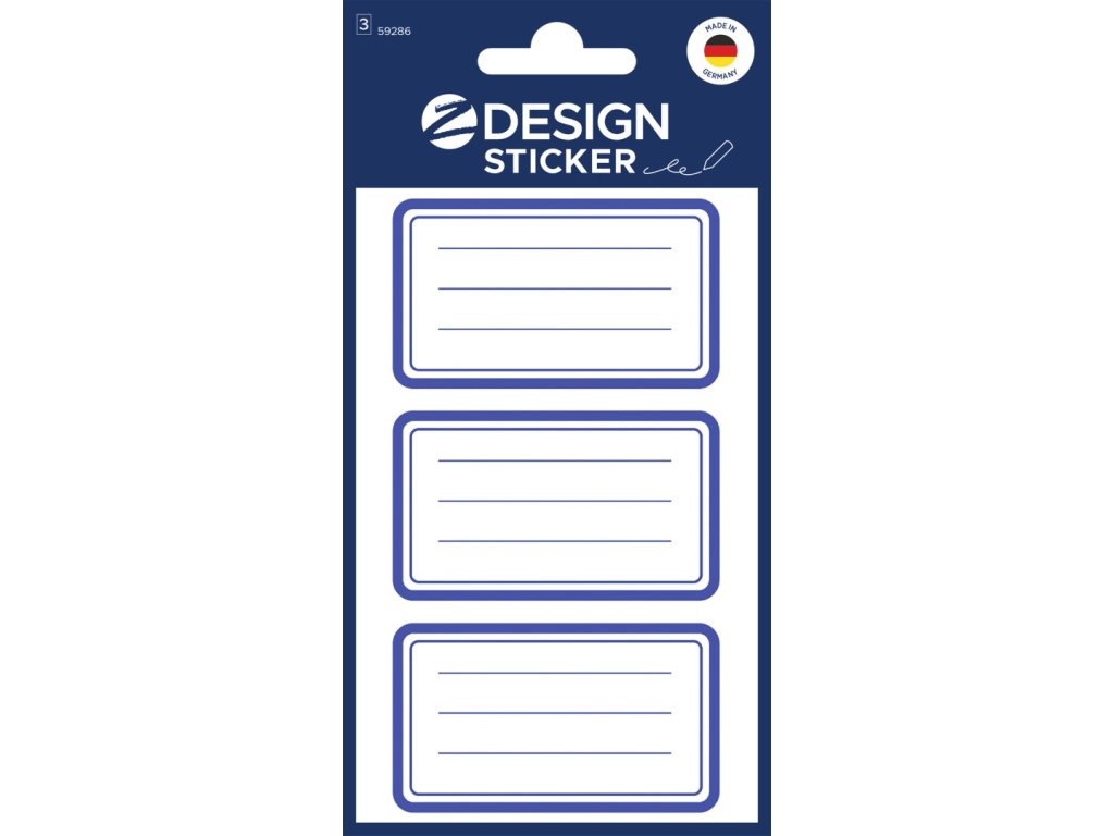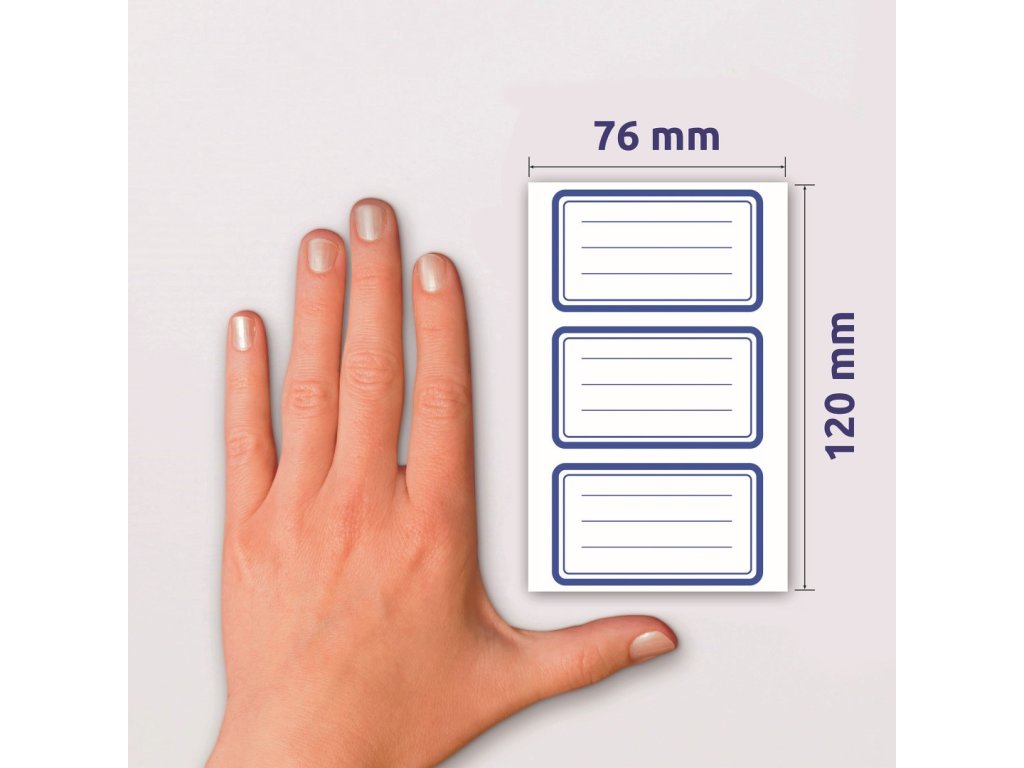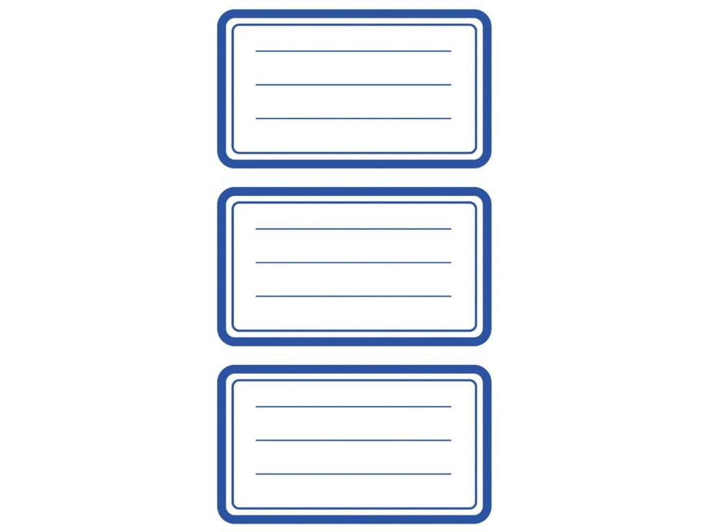 Rozměr 70x36 mm, 9 ks etiket v balení, papírové, permanentní lepidlo, motiv modrý rámeček. Balení obsahuje 3 stejné aršíky vyobrazených samolepek.