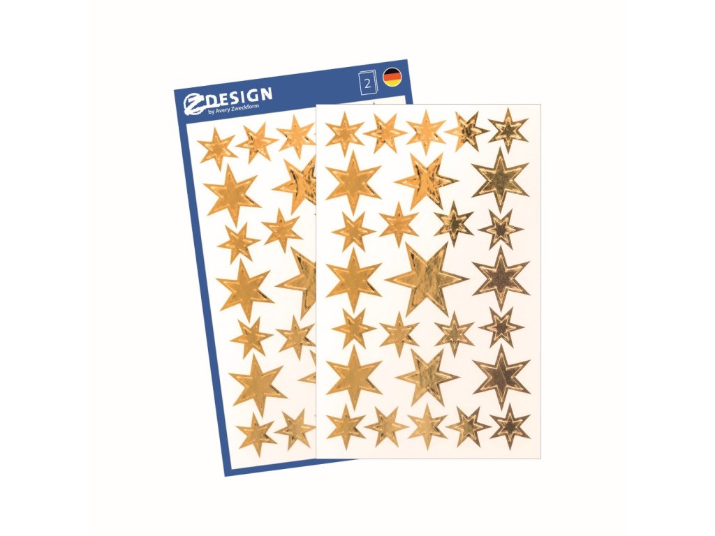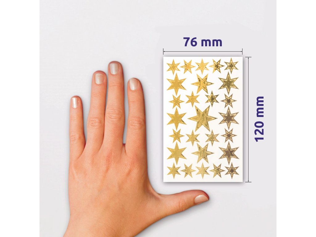 54 ks samolepek v balení, fóliové, permanentní lepidlo, motiv hvězdičky. Balení obsahuje 2 stejné aršíky vyobrazených samolepek.