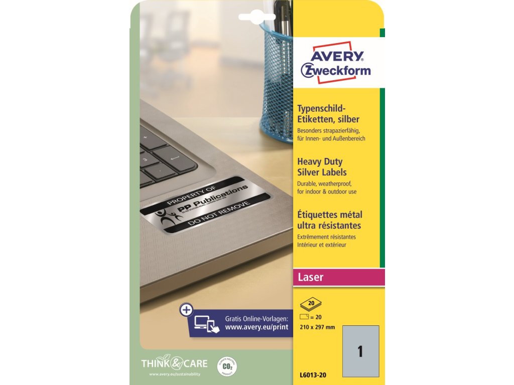 Velmi odolné samolepicí štítky Avery Zweckform L6013-20 o rozměru 210 x 297 mm jsou určeny do nejnáročnějších vnitřních i venkovních podmínek. Jsou ideální pro označování elektronických komponentů, zařízení, výrobků či majetku - jako typové, výrobní štítky nebo inventární štítky a pro dlouhodobé značení v interiéru i exteriéru, kde je vyžadována maximální trvanlivost a čitelnost. Díky vysoké a stálé lepivosti spolehlivě drží na většině běžných povrchů. Tyto matné stříbrné polyesterové etikety (PET) s permanentním lepidlem jsou omyvatelné, odolné vůči stříkající vodě, nečistotám, olejům, mastnotě, roztržení, stárnutí, UV záření a teplotám od -40 °C do +150 °C.