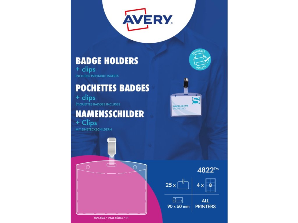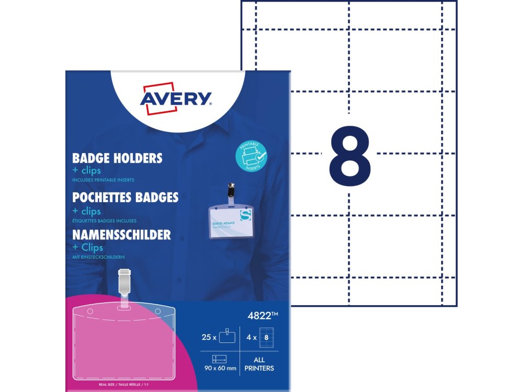 Plastové visačky s klipsem Avery Zweckform 4822 jsou vhodné jako kompletní řešení při pořádání seminářů, konferencí, kongresů, řízení návštěv atp. Sada dále obsahuje papírové štítky, které si potisknete na všech běžných tiskárnách, dáte štítek do visačky a pak už jen připevníte hostům na oblečení. Velice jemná mikroperforace pro snadné vyjmutí jmenovek z archu. Při tisku se můžete spolehnout na bezproblémový průjezd archů tiskárnou bez uvíznutí a ostrý tiskový výstup, který se díky vynikajícímu ukotvení tonerového prášku či inkoustu nerozmazává. Bílé papírové jmenovky ze sady Avery 4822 jsou vhodné pro všechny běžné laserové i inkoustové tiskárny a hodí se i pro ruční popis. Ke všem našim sadám jmenovek nabízíme náhradní štítky v odpovídajících rozměrech. Náhradní potisknutelné papírové štítky k této sadě si můžete objednat pod obj. číslem L4728-20.